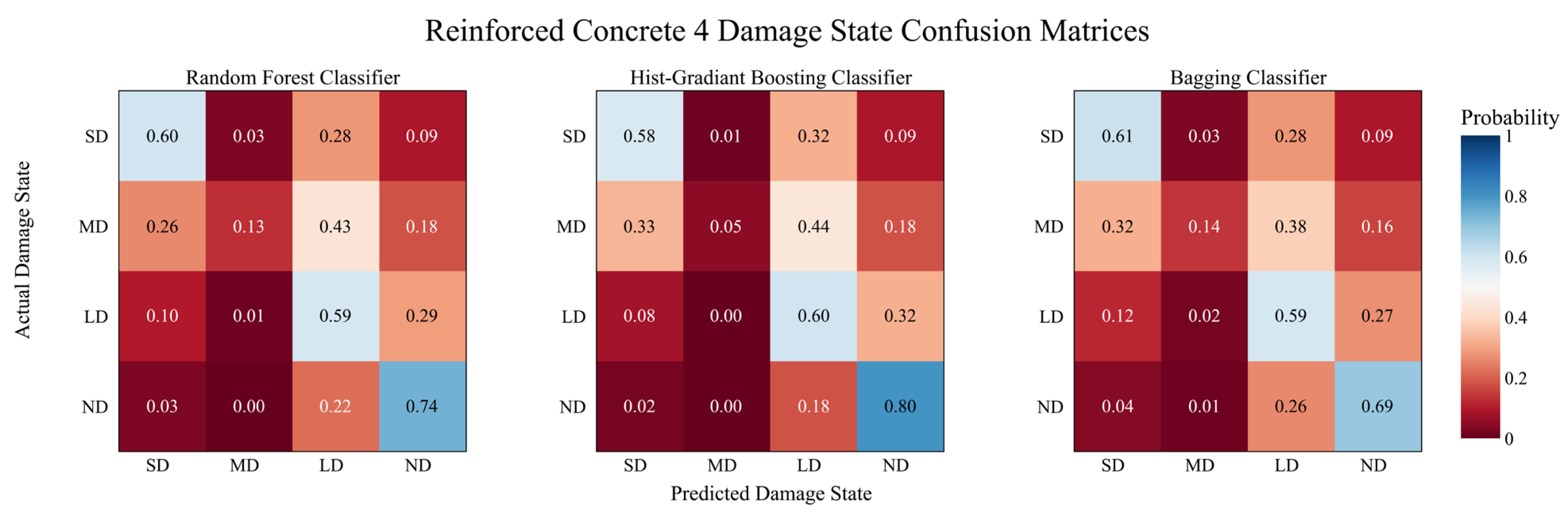 Reinforced Concrete buildings four Damage Classes: For the four-class damage classification of RC buildings, the Bagging Classifier exhibited strong performance (