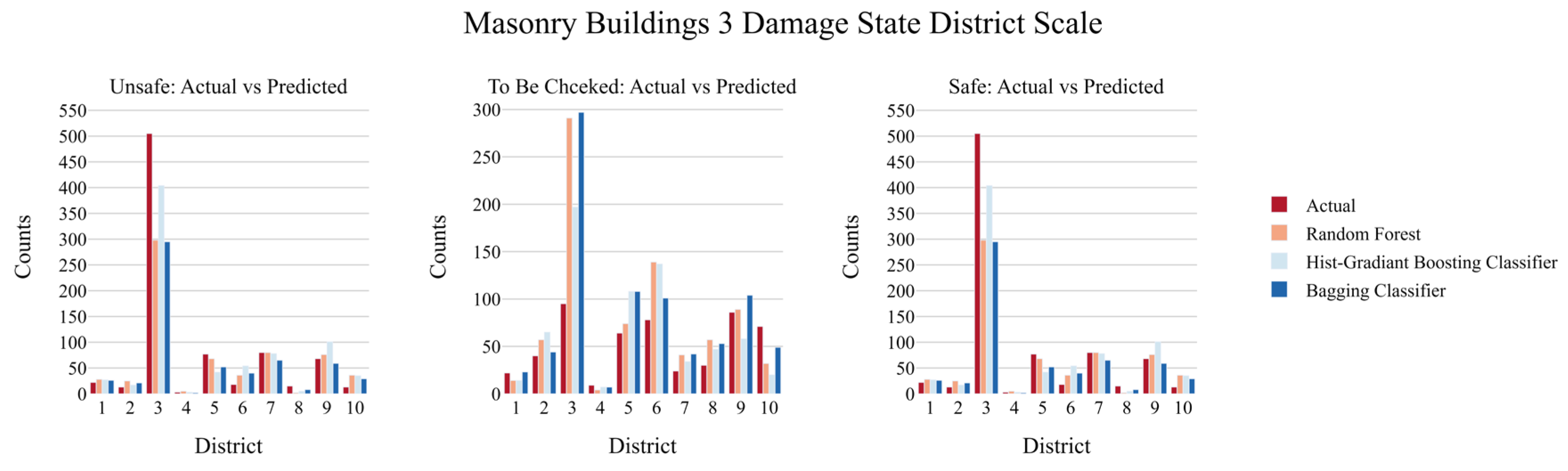 At larger spatial scales, the Bagging Classifier showed strong capability in reproducing observed damage distributions at both district and city levels. This consistency indicates that ensemble-based approaches are effective in aggregating building-level predictions into meaningful urban-scale damage patterns, supporting their use in large-scale seismic risk assessment and decision-support systems.
