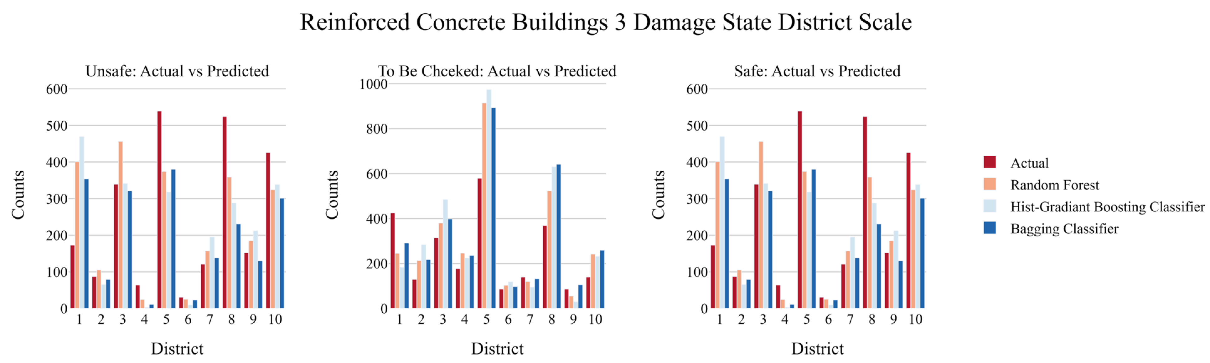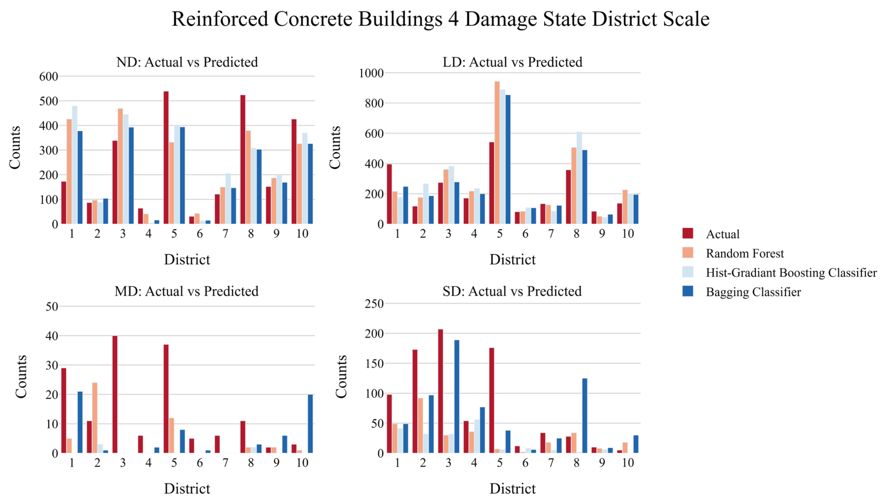Reinforced Concrete buildings three Damage Classes: The three-class damage prediction for RC buildings revealed a higher degree of misclassification, resulting in significant overlap and confusion among damage states in multiple districts (
