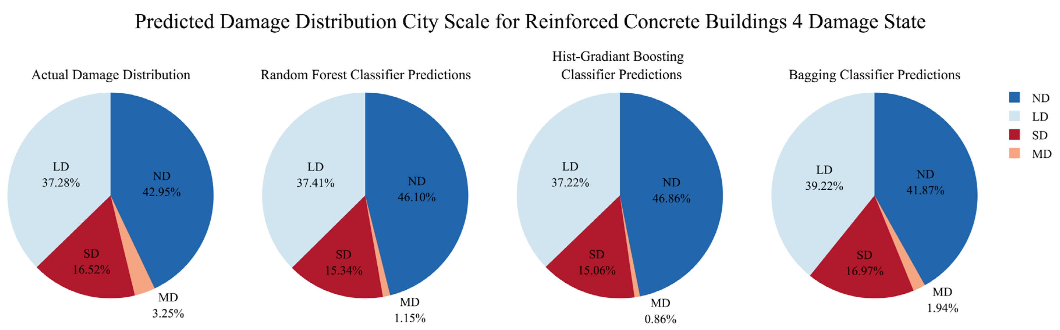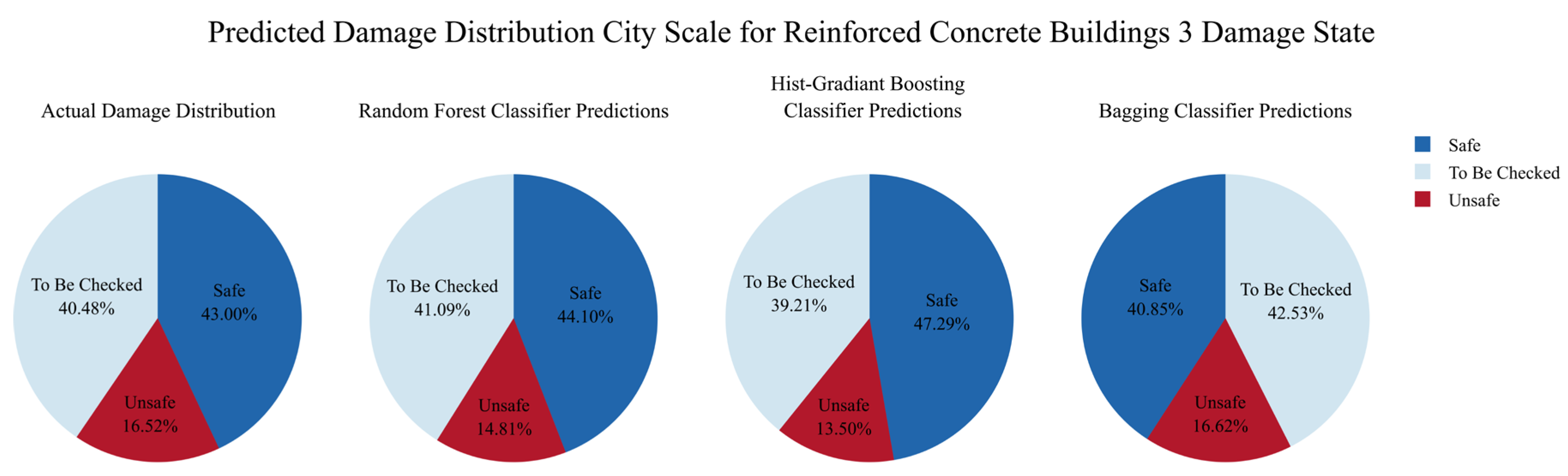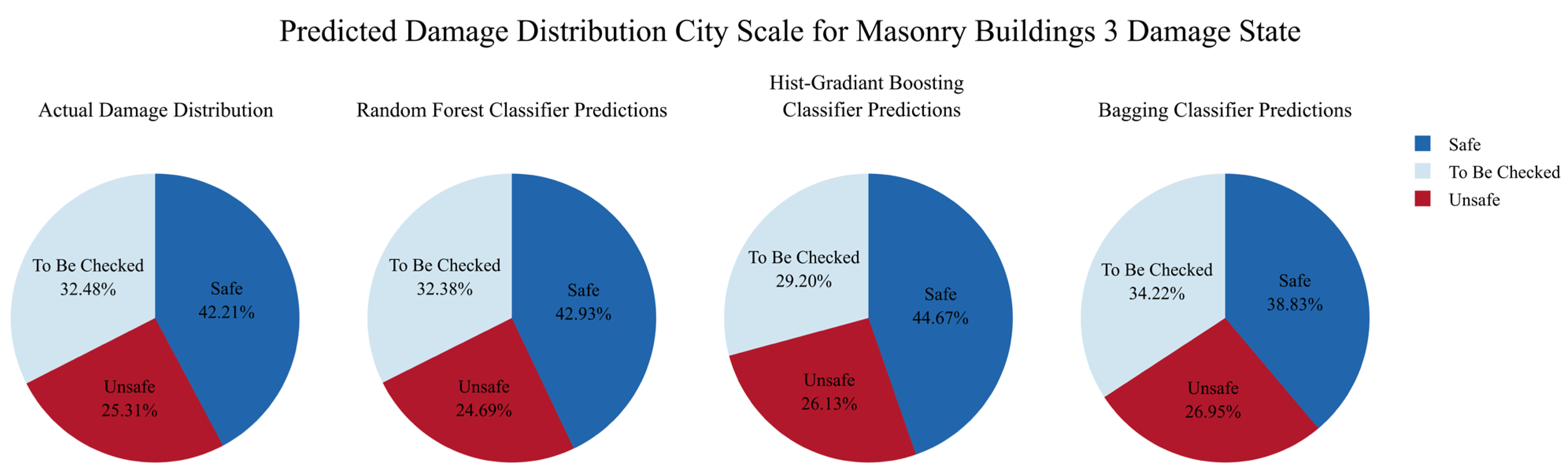 The city-scale evaluation extends the analysis of model performance by aggregating predictions across the entire validation dataset. This approach enables a broader assessment of the models’ ability to reproduce the overall damage distribution at the urban level, similar to the methodology employed in the district-scale analysis. The performance of each classification model was compared against the actual damage distribution, with a particular focus on the Bagging Classifier due to its consistently strong performance across previous evaluations.