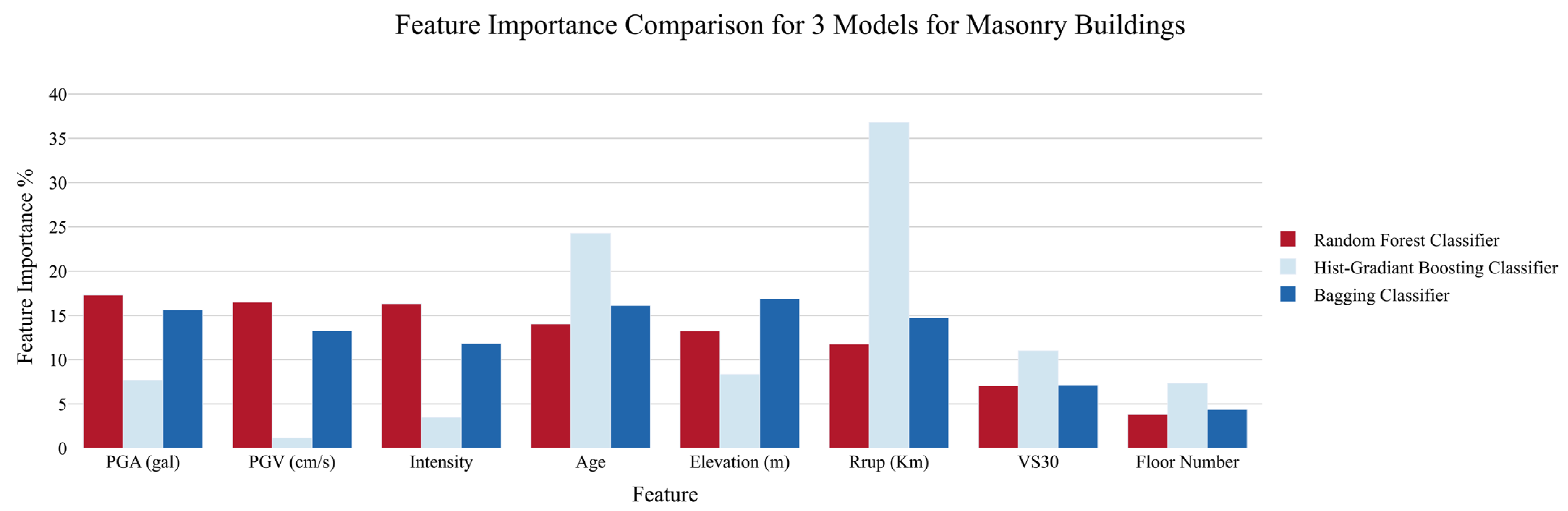 Masonry Buildings: For the Random Forest model, the ground motion parameters emerged as the most significant features. In the Histogram-based model, rupture distance was identified as the dominant feature. For the Bagging classifier, PGA, building age, elevation, and rupture distance were found to have comparable influence (