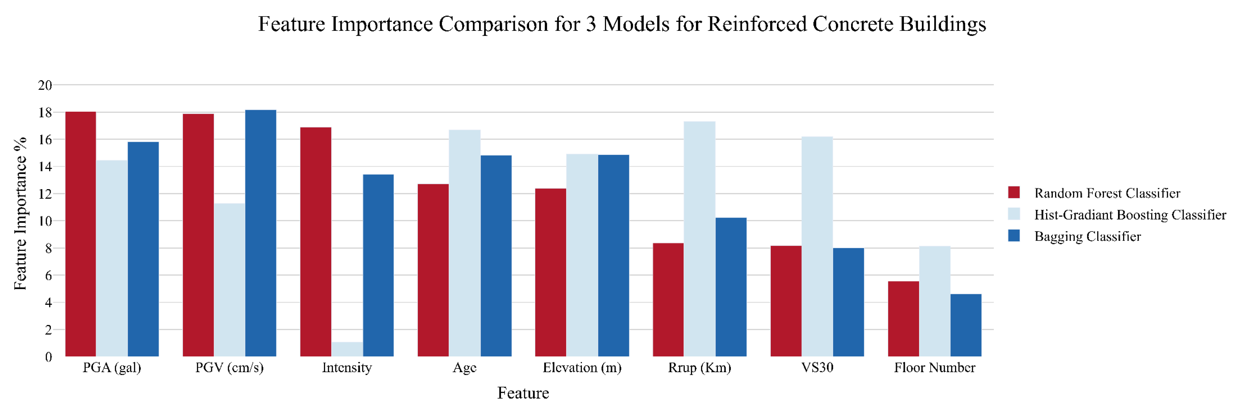 Reinforced Concrete Buildings: For the Random Forest model, the ground motion parameters were again identified as the most influential features. In the Histogram-based model, rupture distance was the dominant parameter. For the Bagging classifier, PGV was identified as the most important feature (