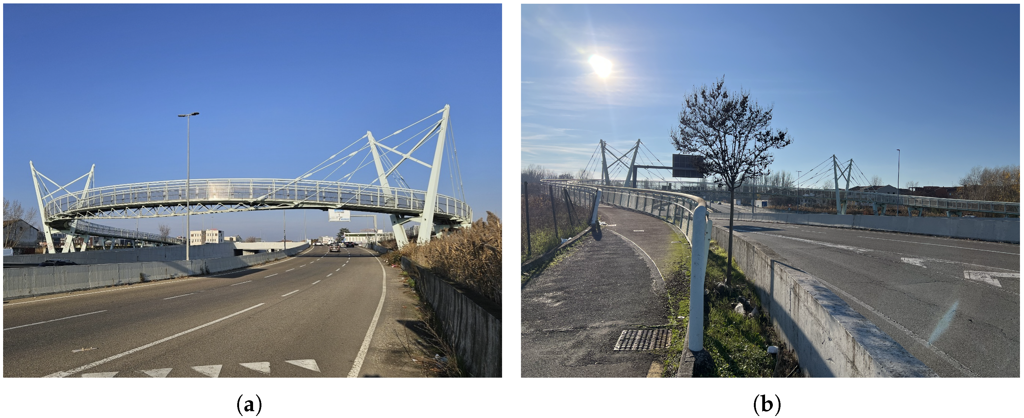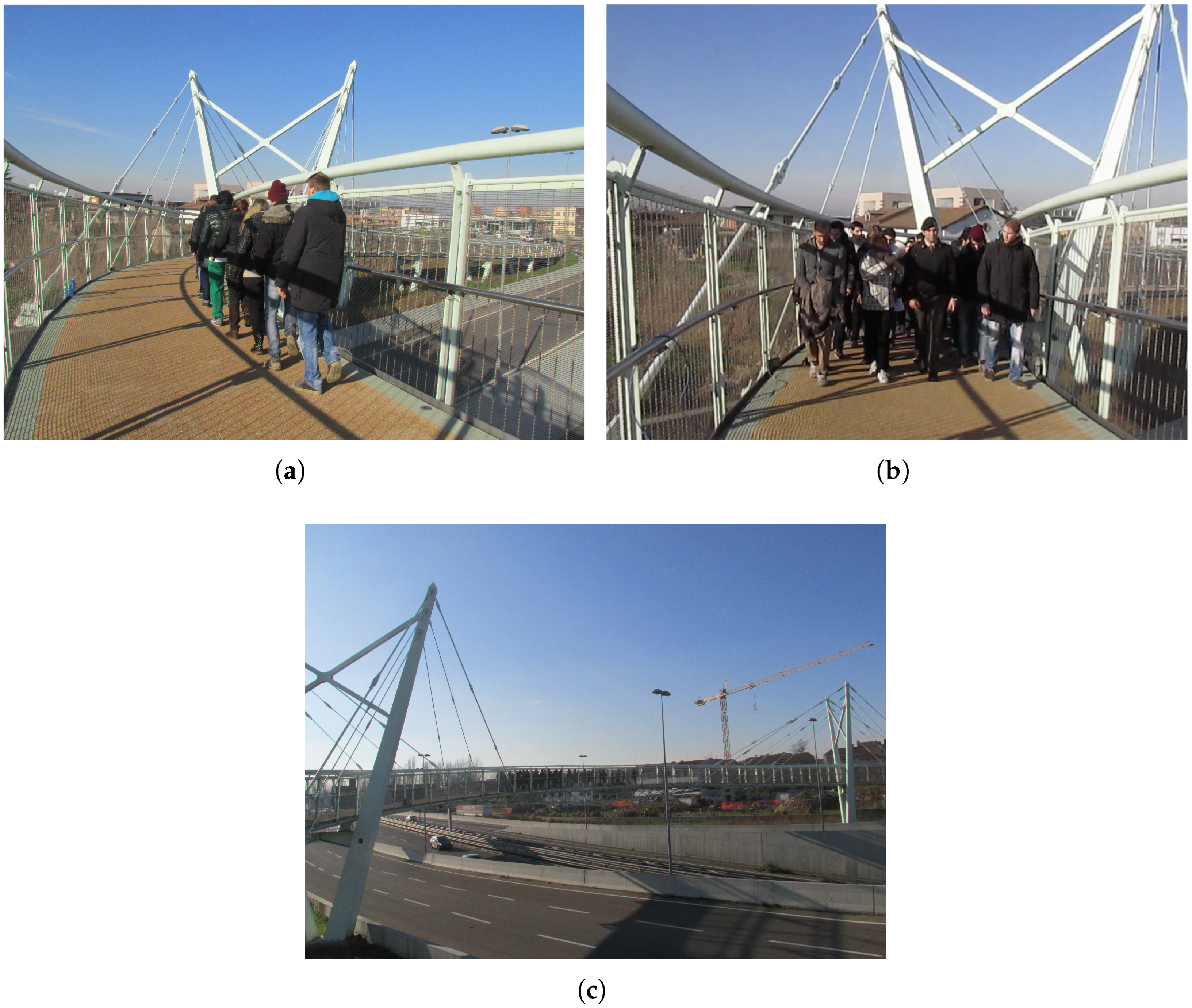 In conclusion, this study demonstrates that bending-only analyses are oversimplified and that accounting for torsional effects induced by pedestrian activity is essential, especially when pacing excites torsional modes or loading is eccentric, as confirmed experimentally. The mathematical frameworks adopted here do not consider cross-sectional transverse deformations or human-structure interaction, as in current guidelines, but they are torsion-aware, thus advancing the footbridge serviceability state-of-the-art.