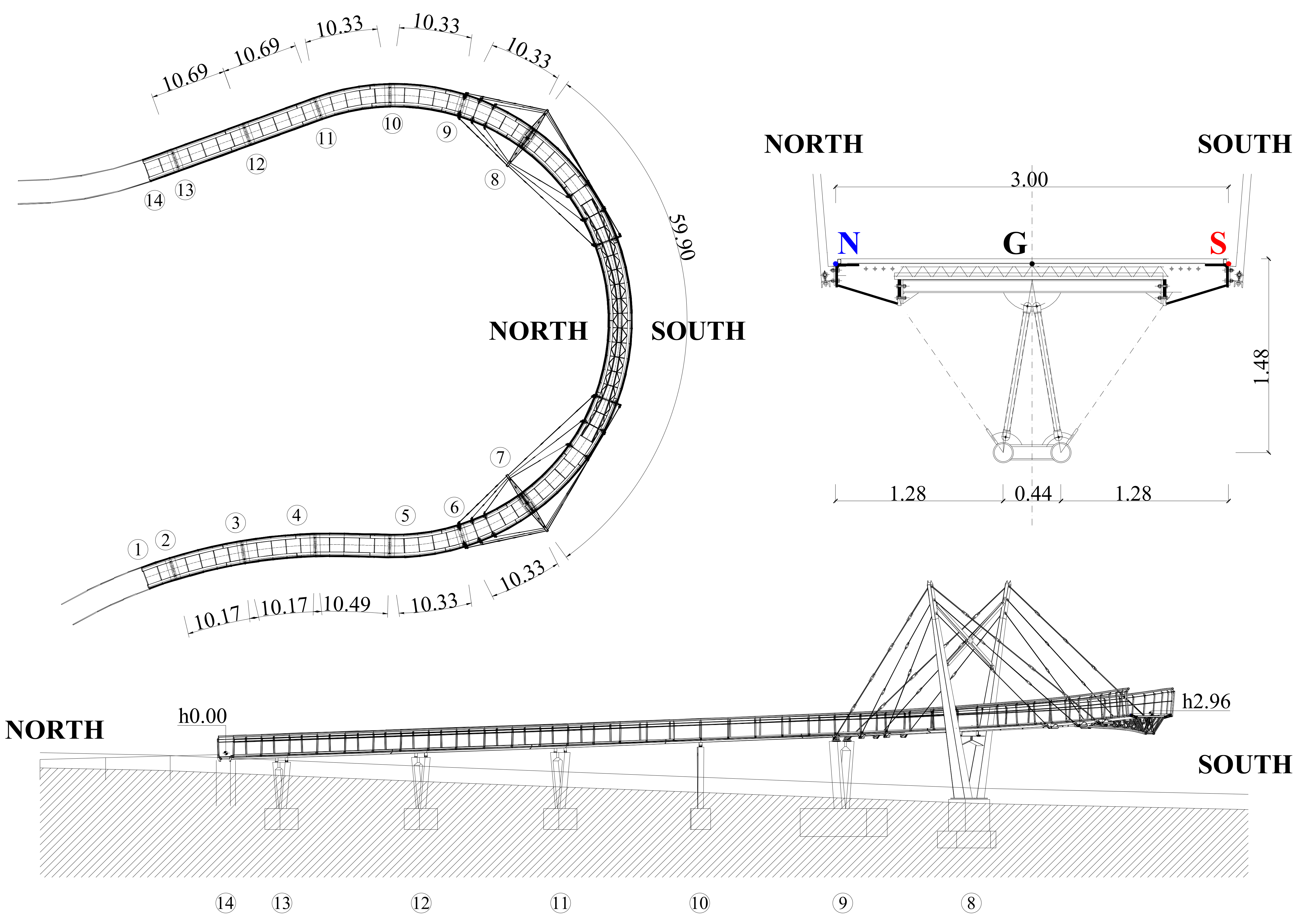 y-axis represents the deck width. To simplify the simulation, the curved trajectory is then unwrapped into a linear configuration, taking advantage of the relatively small curvature of the central span. Note that, unlike the other numerical simulations performed, the reference system for the