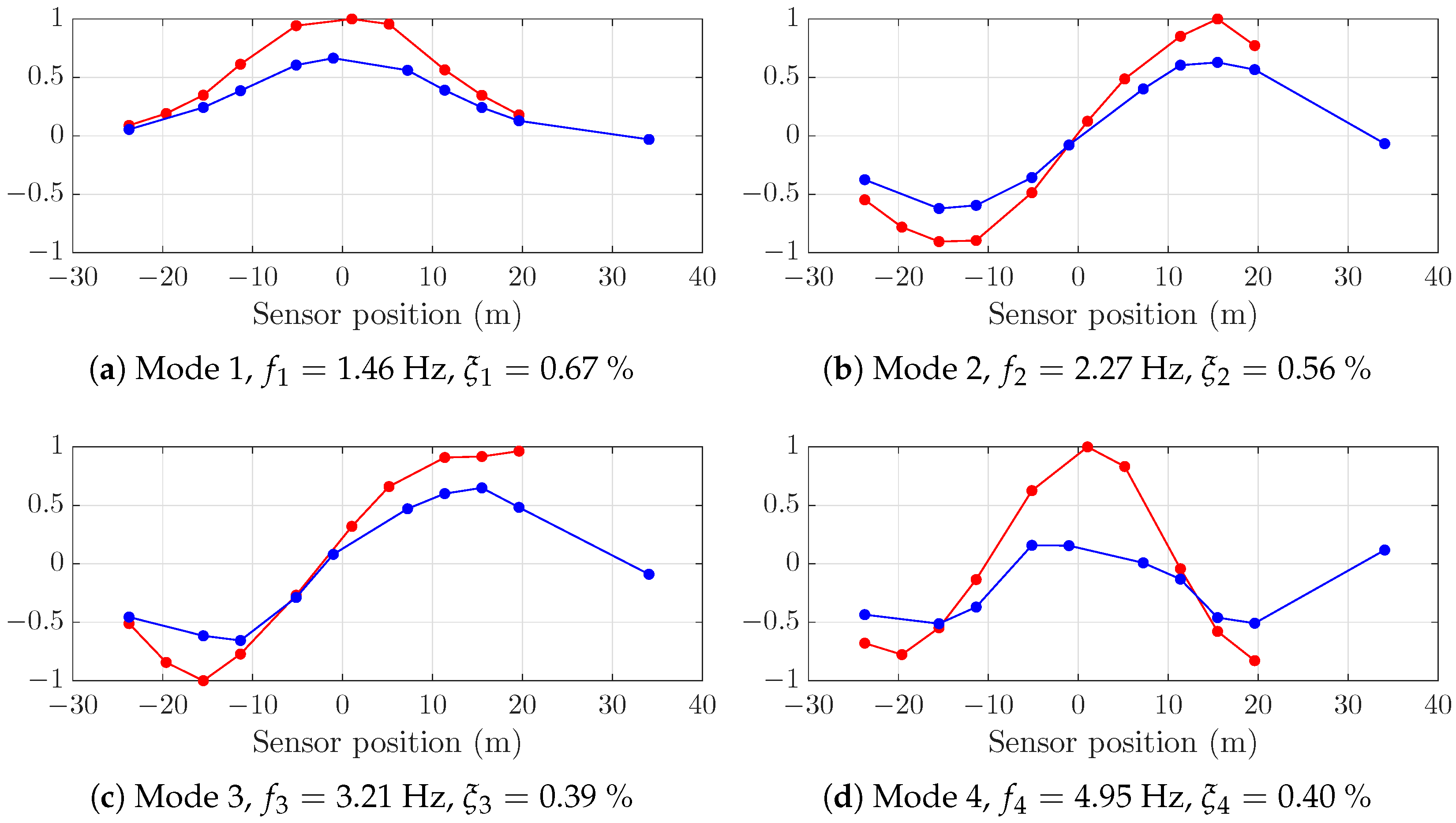 , respectively. The analysis considers modal configurations ranging from predominantly first bending modes (with