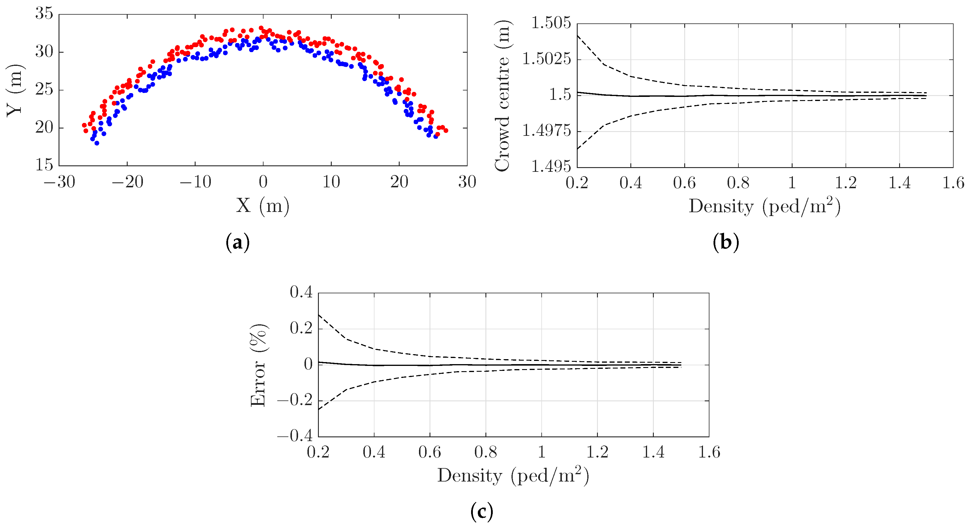 y of all pedestrians. The mean and standard deviation of the crowd centre of mass are then computed across the 10,000 simulations for each density, where a location at 1.5 m corresponds to the centreline (see