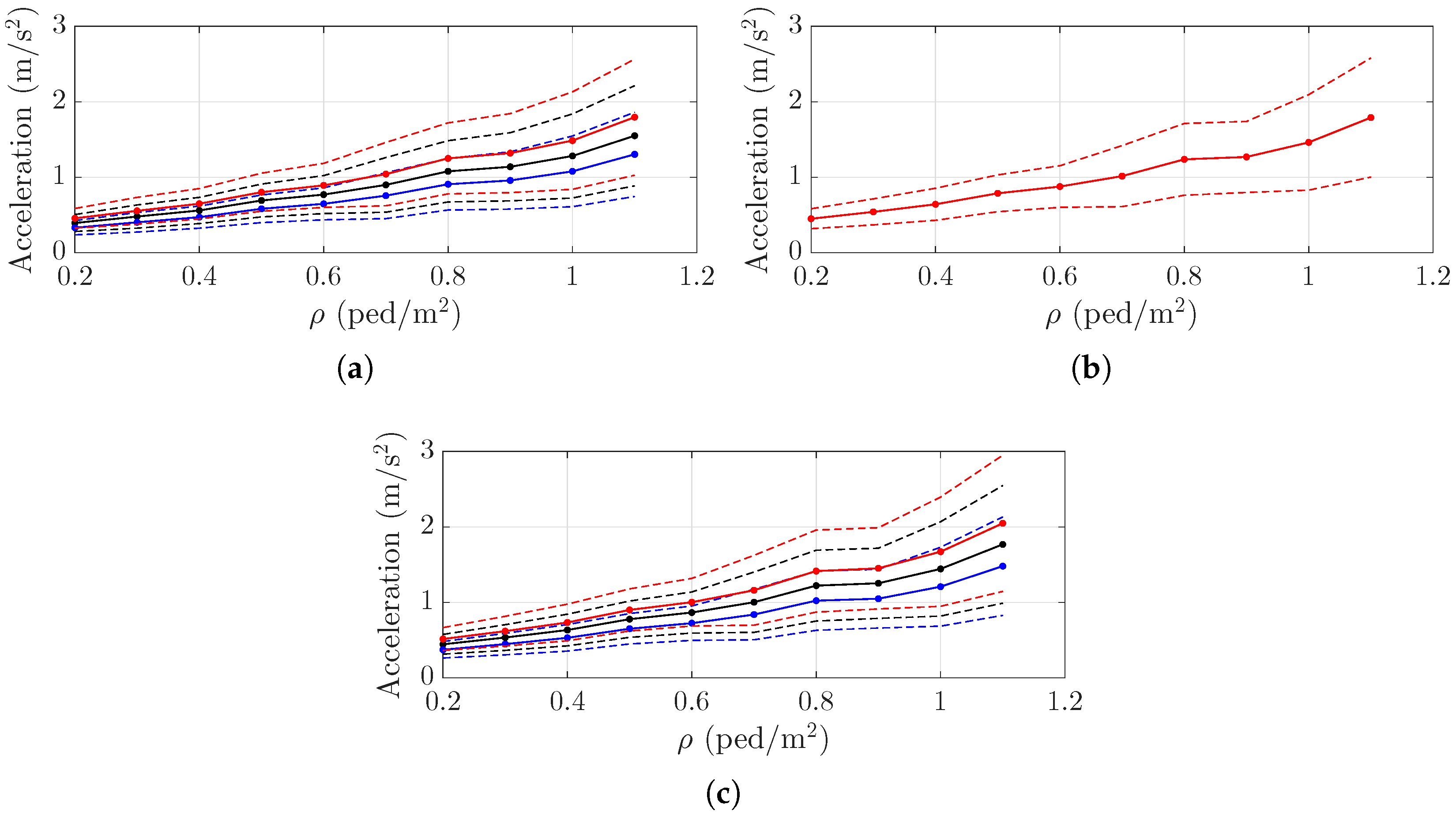 Figure 11, including those obtained by the bending-only, bending-torsion, and simplified approaches. Specifically, results are presented as the mean (solid line) and one standard deviation (dashed lines) over the 100 simulations performed for each crowd density, as functions of the traffic level and transverse coordinate