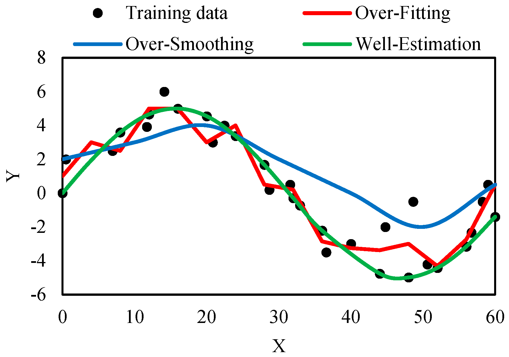 K ( . ) and h represent the Kernel function and smoothing (bandwidth) parameters, respectively. The smoothing parameter h for each x is defined as the maximum distance to the θ nearest neighbors of x. The smoothing parameter controls the complexity of the model [60]; a large smoothing parameter may over-smooth the prediction, while an extremely short one over-fits the training data, i.e., produces a high fluctuation in estimation, as shown in Figure 2 [61]. In this article, the parameter θ , which may range from 1 to n, is selected through a trial-and-error process to minimize the prediction error.