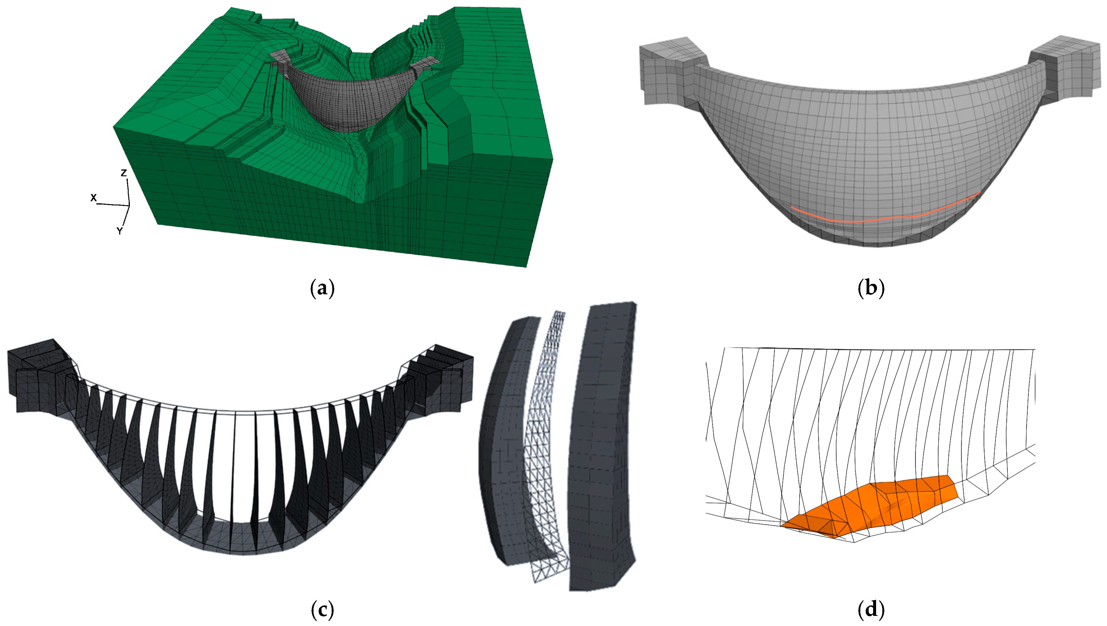 In this study, the El Atazar dam in Spain is selected as a case study (Figure 4). It is a high, thick, double-curvature concrete arch dam with a height of 141.4 m and a crest length of 484.0 m. The dam body is divided into 21 blocks with vertical contraction joints. The central cantilever thickness at the base and crest measures 36.0 m and 6.5 m, respectively [63]. Figure 5 illustrates the discrete element model of the dam and foundation developed using FLAC3D [64]. The model provides a detailed representation of the foundation layout (Figure 5a), the dam’s geometry (Figure 5b), the vertical contraction and peripheral joints (Figure 5c), and the historical injected crack surface of the dam body (Figure 5d). According to ICOLD recommendation [65], the foundation is extended at least 1.5 times the dam height in all directions. The discrete element model comprises a total of 28,306 elements and 15,337 nodes.