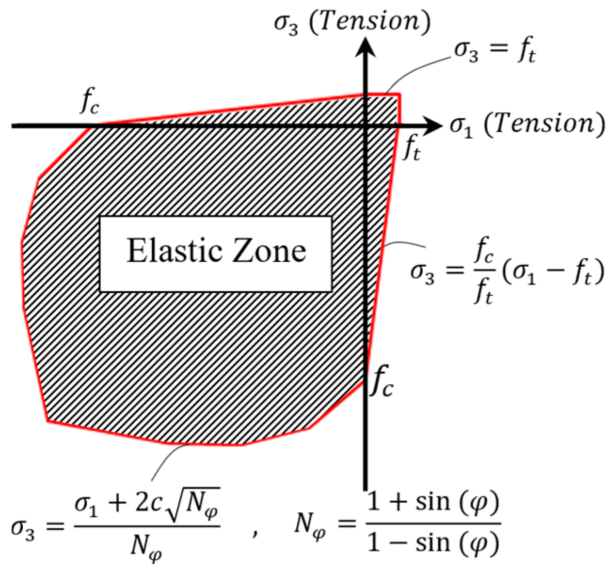 Figure 6. The yield surface used for the dam body concrete. Here, σ 1 , σ 3 , f t , f c , c , and φ are the minimum and maximum principal stress, uniaxial tensile and compressive strength, cohesion, and friction angle, respectively.