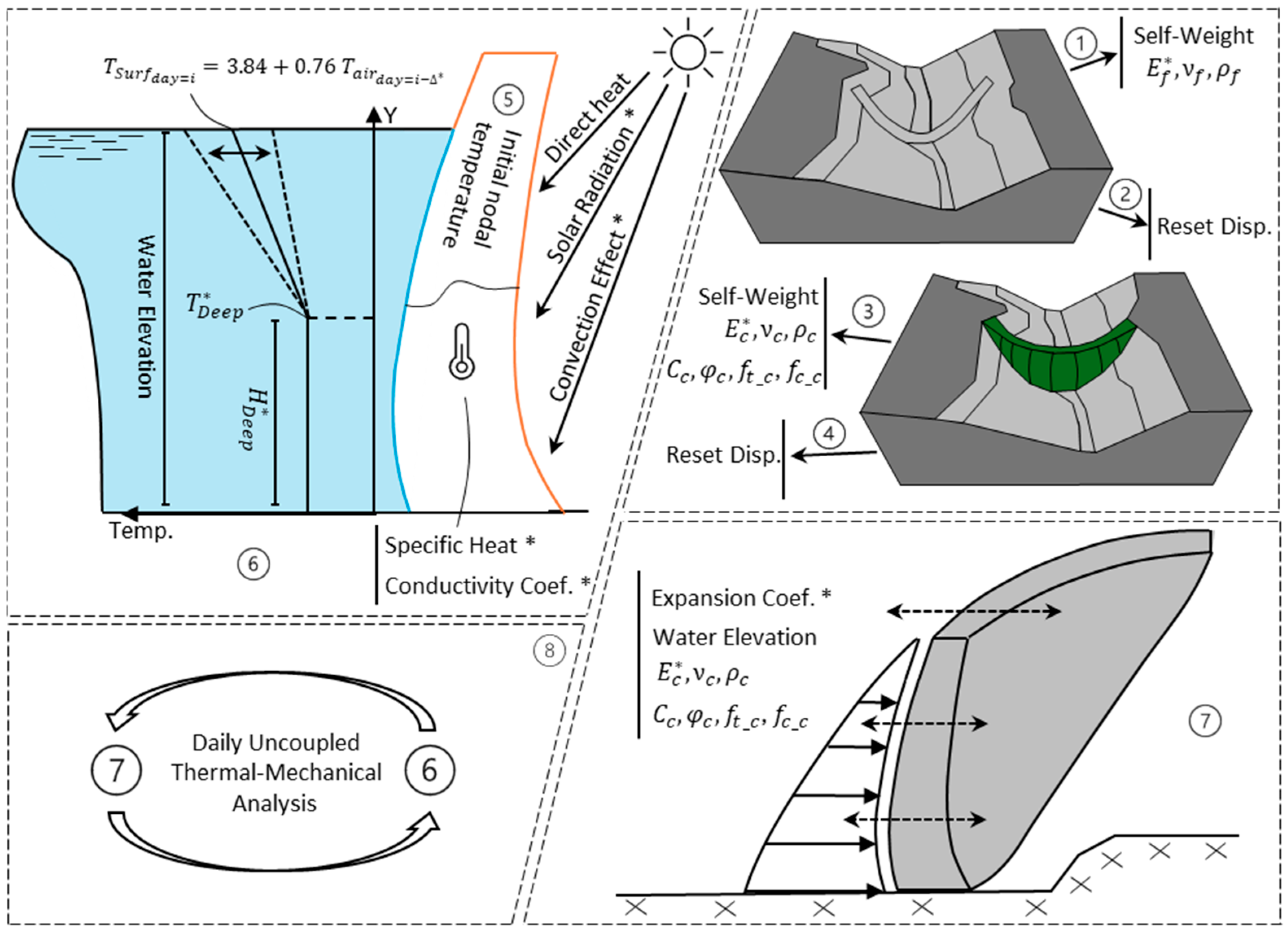 • Thermal Simulation: Thermal boundary conditions for day i + 1 are applied to the upstream and downstream faces of the dam body. These conditions are categorized as dry or wet based on whether the surface is in contact with the reservoir. The dry boundaries are influenced by the air temperature, solar radiation, and convection effects. The wet boundaries are defined by the water temperature, which varies in response to air temperature fluctuations and reservoir elevation. Further details on these boundary conditions are provided in Section 4. After applying the thermal boundary conditions, a transient uncoupled thermal analysis is performed over one day (86,400 s). In this step, the temperature variations do not induce deformations.