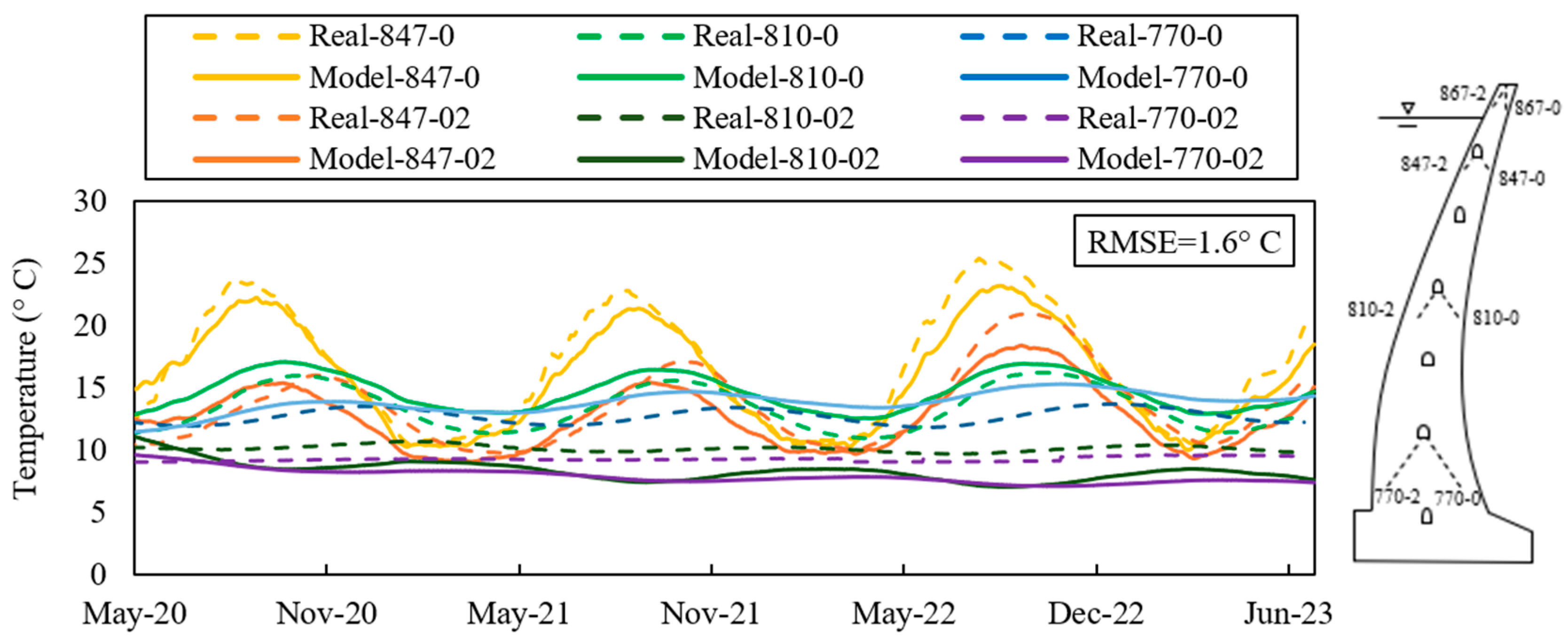 After this step, the remaining thermal calibration variables are adjusted using a similar strategy to simulate the temperature distribution on the downstream surface and within the dam body. Figure 10 illustrates a comparison between the model’s nodal temperatures and thermometer readings for the central cantilever over a period of three years (the fitting period in Figure 8), using the calibrated values listed in Table 2. The results show a good agreement between the simulated and observed temperatures, with a root mean squared error (RMSE) of 1.6 °C.