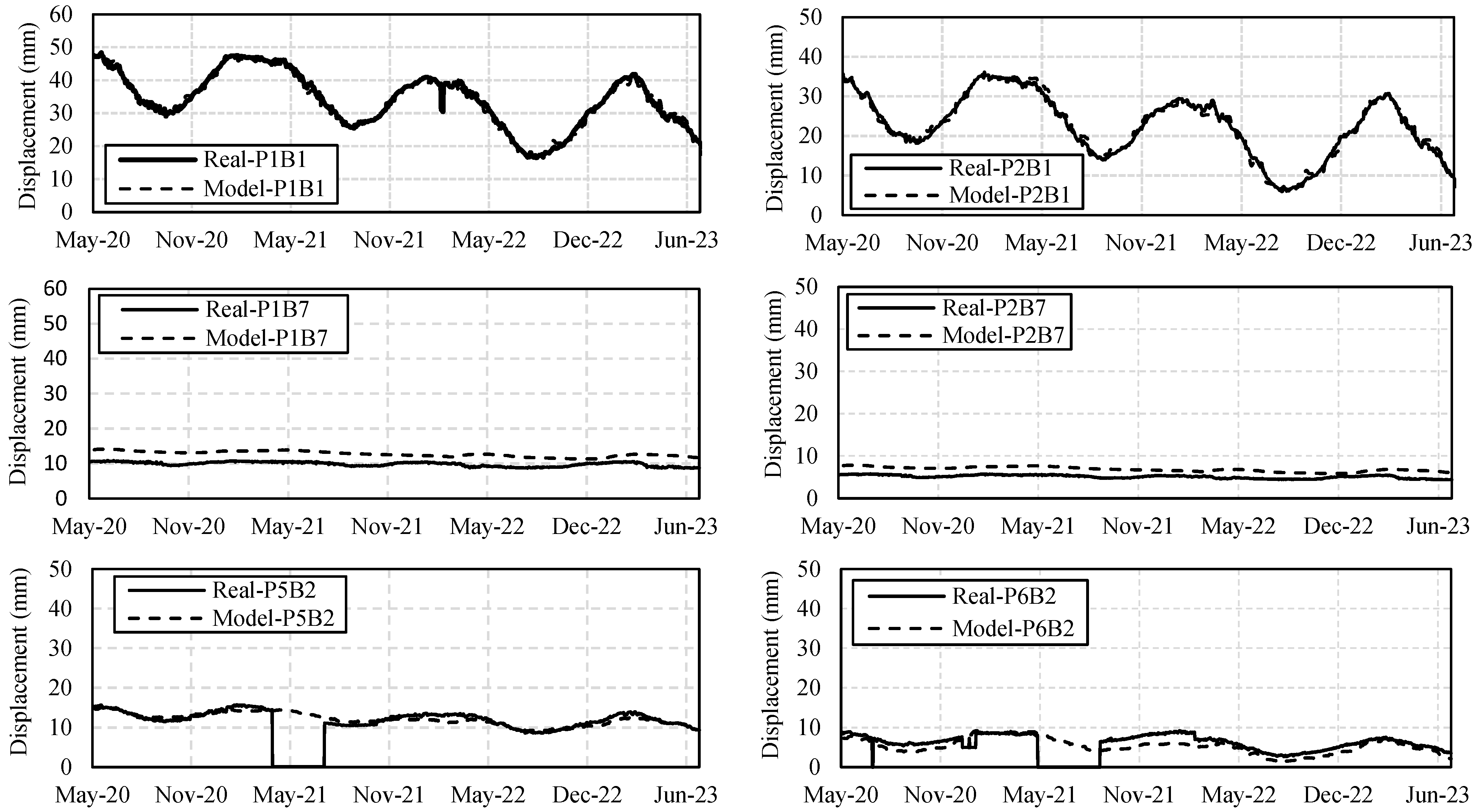 Once the temperature field within the dam body concrete is calibrated, displacement calibration is performed over a 3-year period (the fitting period in Figure 8) using a similar iterative adjustment of the mechanical properties of the dam and foundation, while ensuring that all adjustments remain within the rational parameter ranges reported in the dam project documents. The mechanical parameters selected for calibration include the elastic modulus of the concrete ( E c ), the deformation modulus of the foundation ( E f ), and the thermal expansion coefficient, and the rest are considered deterministic. These calibration parameters were chosen due to their relatively significant effect on the stress-deformation response of high concrete arch dams [70,71,72]. For the comparison, the pendulum reading points P1B1, P1B7, P2B1, P2B7, P5B2, and P6B2 are chosen (Figure 11). The final calibrated mechanical parameters are listed in Table 3. It is worth noting that two different deformation moduli are assigned to the left and right abutments to account for the greater radial movement observed in the left-side pendulums compared to those on the right. As shown in Figure 12, the numerical model is able to predict the real displacements with high precision.