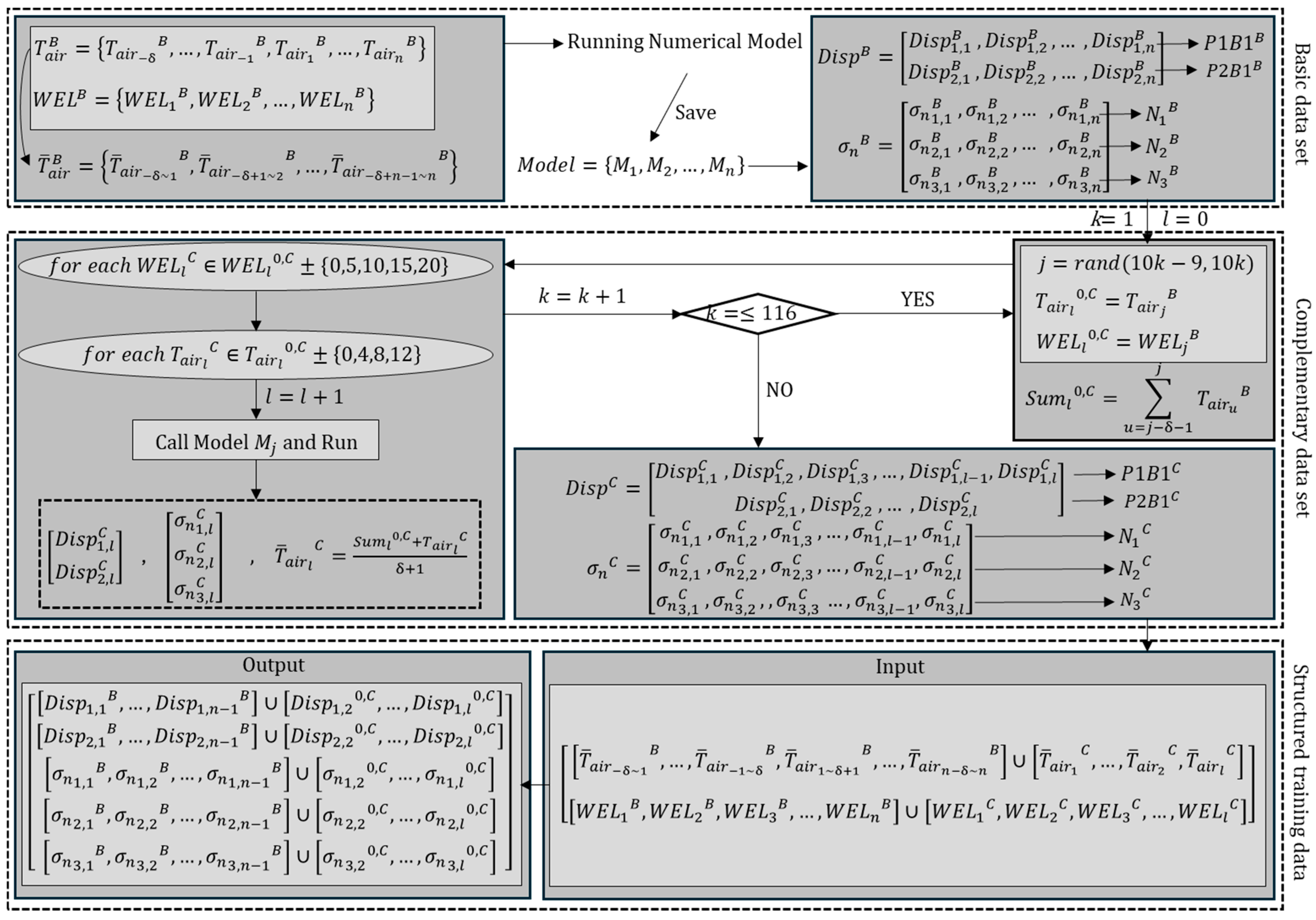 Figure 13. The flowchart of the training data preparation process. B, C, and n denote the basic dataset, complementary dataset, and day index, respectively. T a i r n and W E L n represent the air temperature and water elevation on day n, respectively. T ¯ a i r i ~ j is the mean air temperature from day i to j.  M n denotes the saved numerical model for day n. Disp and σ n   represent the displacement and normal stress, respectively. All remaining parameters were defined previously.