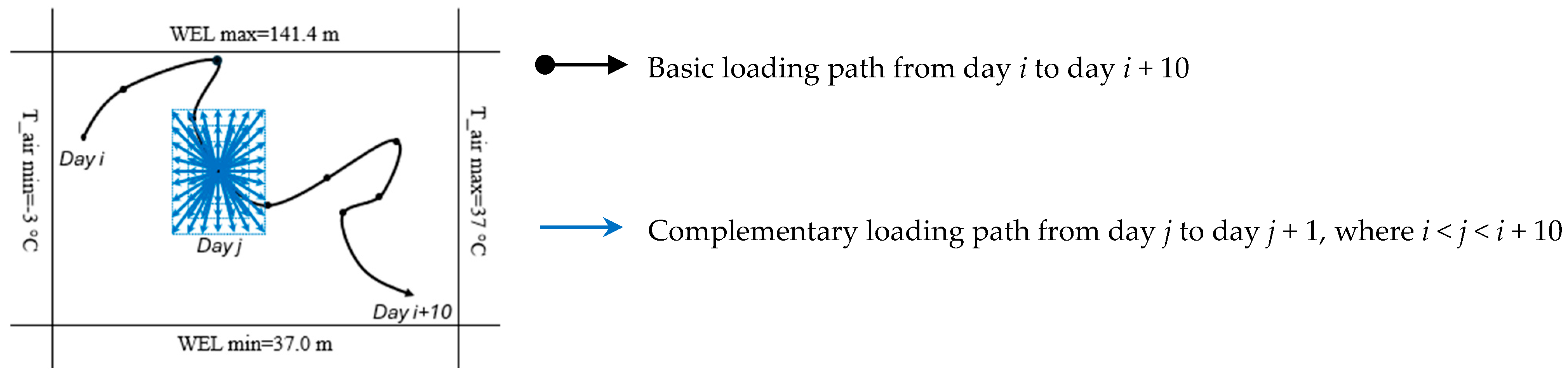 For each selected day, the analysis is extended by one additional day under a hypothetical loading path characterized by variations in water elevation and air temperature (Figure 15). These new loading conditions are carefully chosen to represent a wide range of possible unseen loading paths. In this article, the possible daily changes in water elevation and air temperature are limited to a maximum of 20 m and 12 °C, respectively: