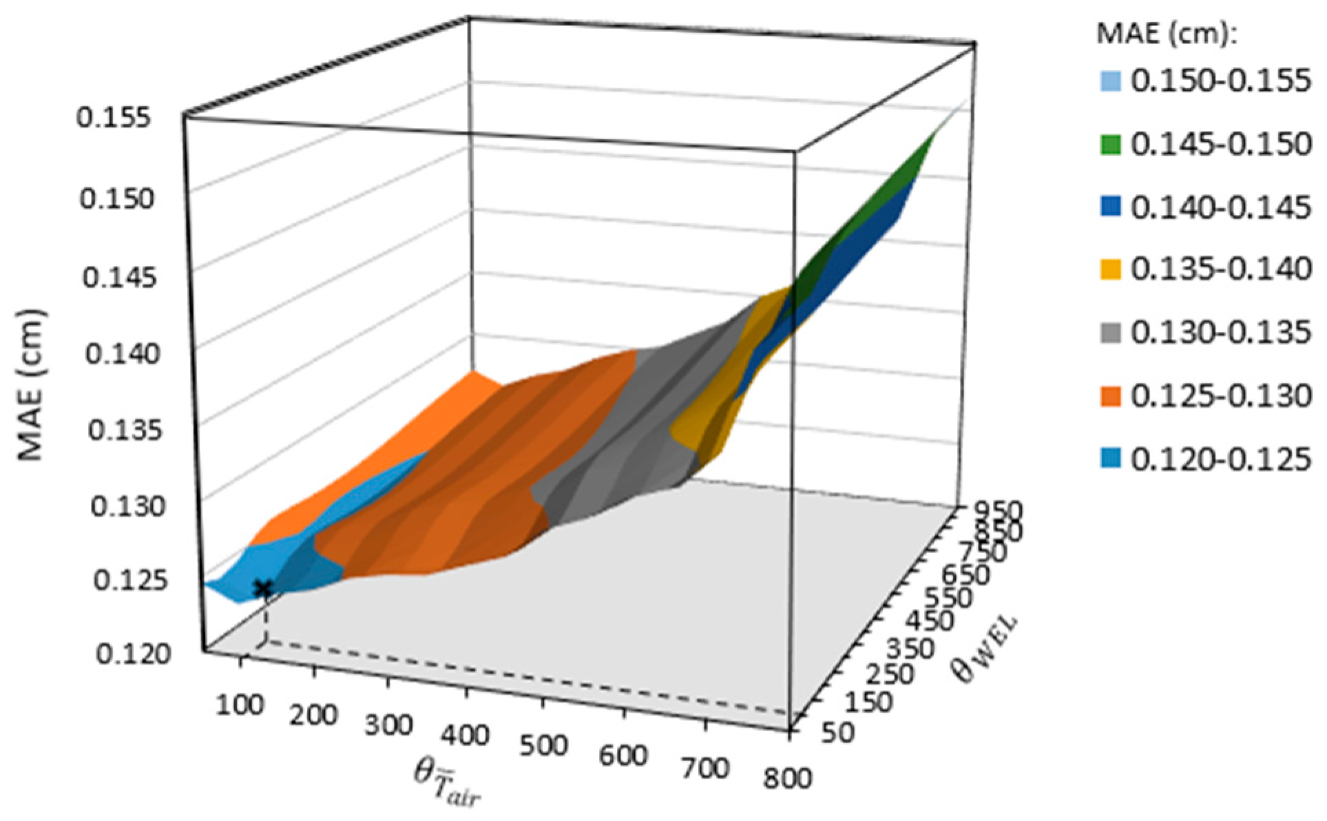 where T S u r f d a y = i , T a i r d a y = i , and represent the surface water temperature on day i, the air temperature on day i , and the delay between the maximum air and surface water temperatures, respectively. For the wet surface temperature calibration, the depth and temperature of the deep water, as well as the delay increment, are chosen as the calibration parameters.