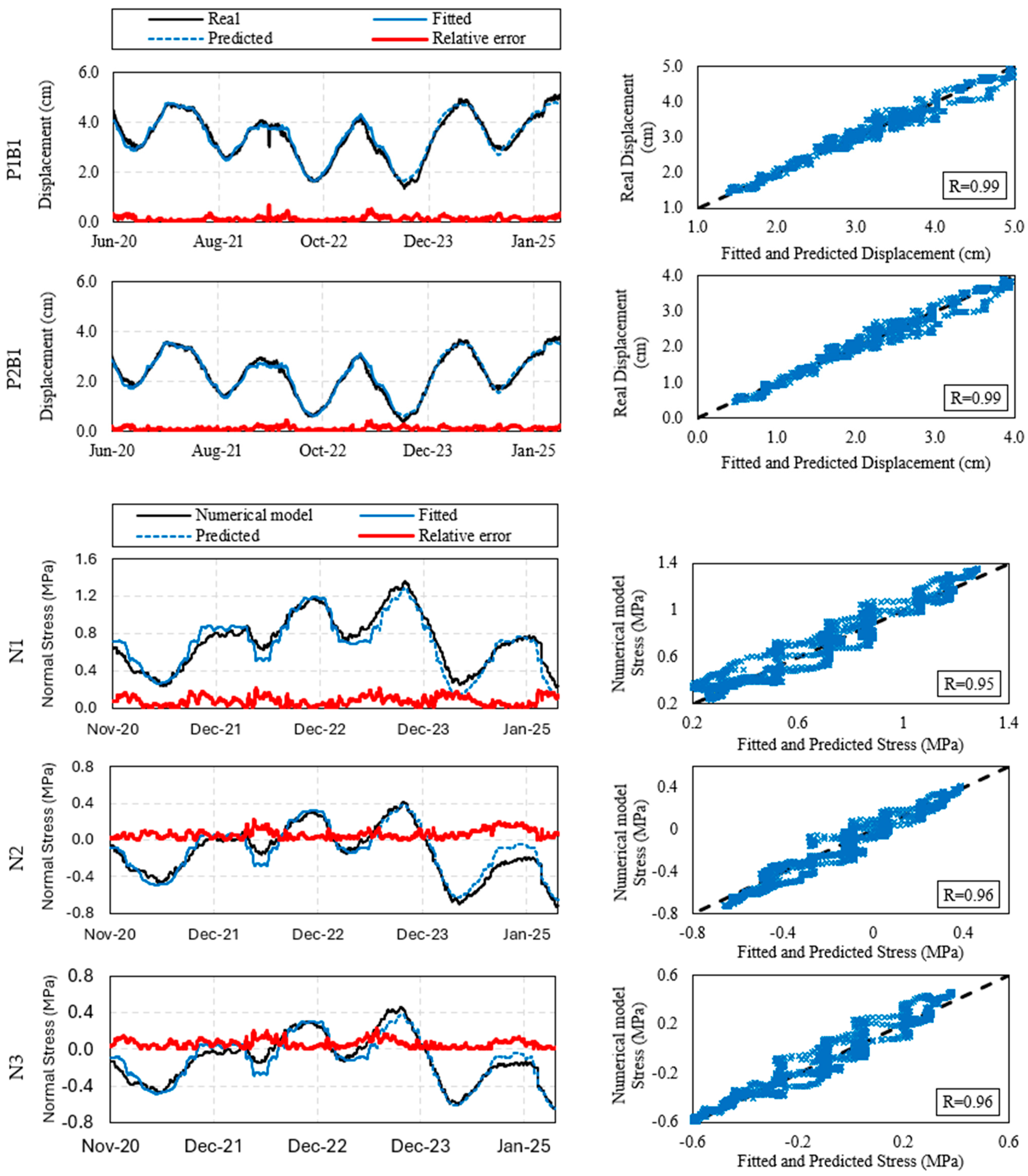 After generating the dataset, the input and output variables are structured for the training model. In this study, the output variables are selected as the radial displacements of pendulums P1B1 and P2B1, along with the normal stress at crack surface points N1, N2, and N3, as defined in Figure 11. However, the methodology described here can be applied to predict other response variables as well. The input variables should be carefully selected to represent the most significant factors influencing the dam’s structural behavior. While some input variables directly impact response estimation, others may have a negligible influence and can be excluded from the model to enhance model efficiency.