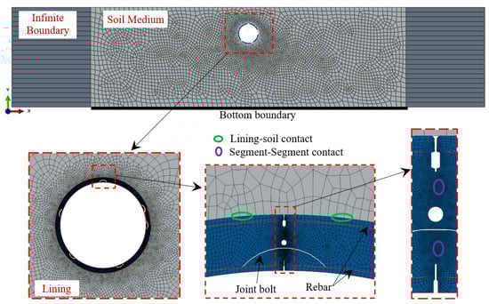 The surface-based contact model in ABAQUS was used to explicitly model the lining-soil and segment–segment interactions, as shown in Figure 2. The hard-contact and Coulomb friction models were implemented to simulate the contact interactions in the normal and tangential directions, respectively. Friction coefficients of 0.6 [35] and 0.45 [36], applied in the tangential direction, were used for the segment–segment and lining–soil contact, respectively.