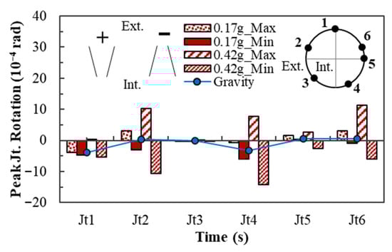The segmental joint deformation is expressed in terms of the tangential joint displacement and joint rotation. The angle of rotation at the joints is defined as the ratio of the difference between the exterior and interior tangential joint displacements to the tunnel lining thickness. The peak clockwise and counterclockwise (“+/−”) joint rotations under the horizontal (H) and horizontal and vertical (H+V) acceleration time histories of the Lytle Creek (Cedar Springs Pumphouse) earthquake (GM2) are shown in Figure 5. Further, the “+” and “−” joint rotations are illustrated in Figure 5. The figure typifies the rotational joint behavior for all the ground motions considered. Notably, the joint rotation behavior exhibited significant variability. According to Figure 5, rotation under the gravity load is high at joints Jt1 and Jt4, whereas rotations under the excitation occur at joints Jt2, Jt4, and Jt5. The larger amplitude shaking excites higher positive (+) rotations at joints Jt2, Jt4, and Jt5, making them more susceptible to groundwater ingress due to the geometric configuration of the gasketed joint. The above observation reveals that the rotation of the joints can be significantly affected by ground shaking, and the effects could vary greatly depending on the amplitude of the excitations.