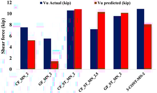 where is the maximum applied load by the actuator that caused the reinforced concrete beam to fail in shear. The corresponding predicted maximum load is calculated using Equation (13) from the Canadian Educational Module Code: