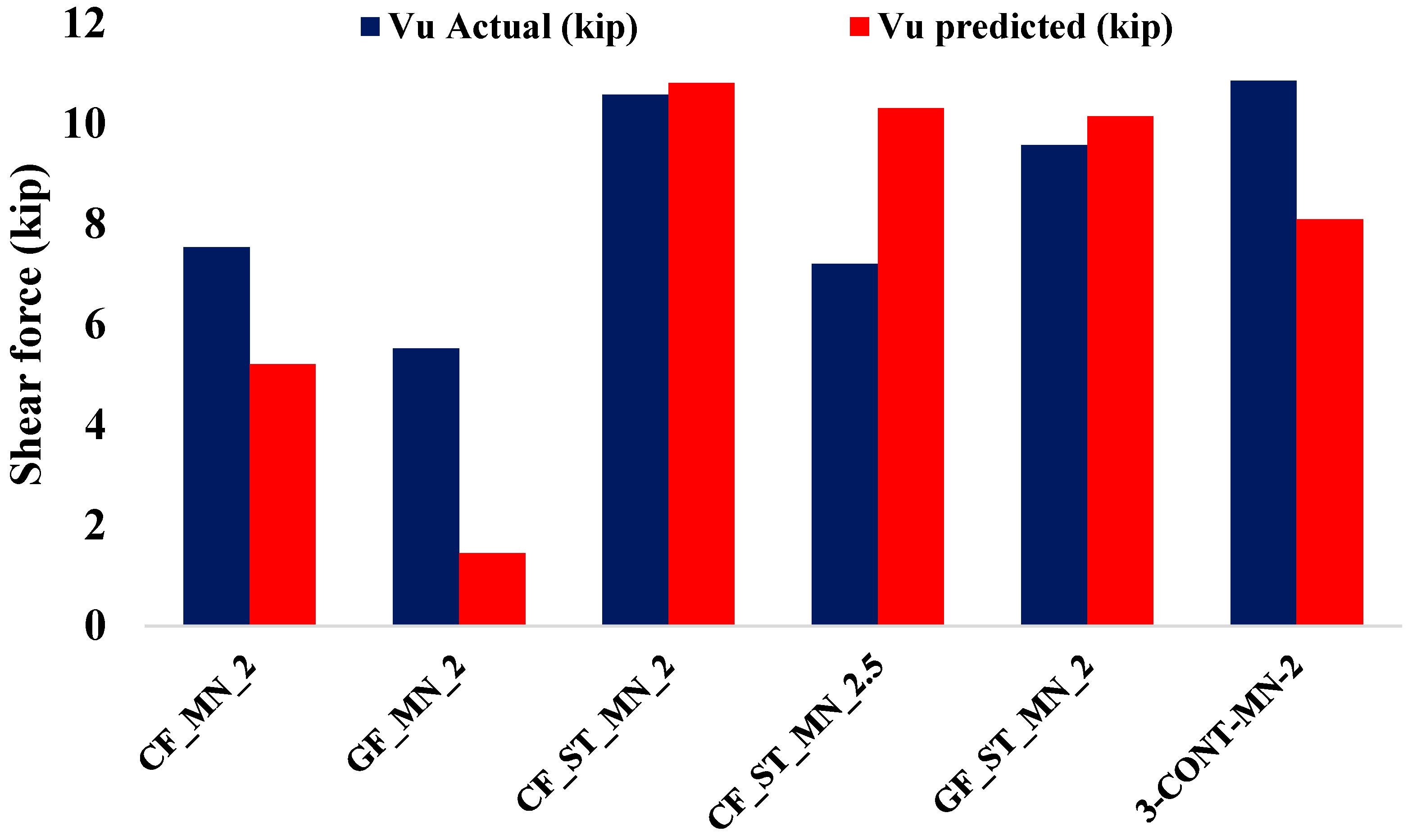 For the FRP-only specimens, the differences between predicted and measured shear strengths were substantial. The GF_MN_2 specimen demonstrated an experimental shear strength of 5.53 kips compared to a predicted value of 1.45 kips, indicating an underestimation of nearly 280%. Similarly, the CF_MN_2 specimen achieved a measured shear strength of 7.54 kips against a predicted value of 5.21 kips, exceeding the predicted value by approximately 45%. These significant discrepancies highlight the conservatism inherent in current design equations for FRP-only beams without shear reinforcement, likely due to the omission of beneficial mechanisms such as crack-bridging, aggregate interlock, and localized stress redistribution provided by FRP grids, even in the presence of brittle failure modes.
