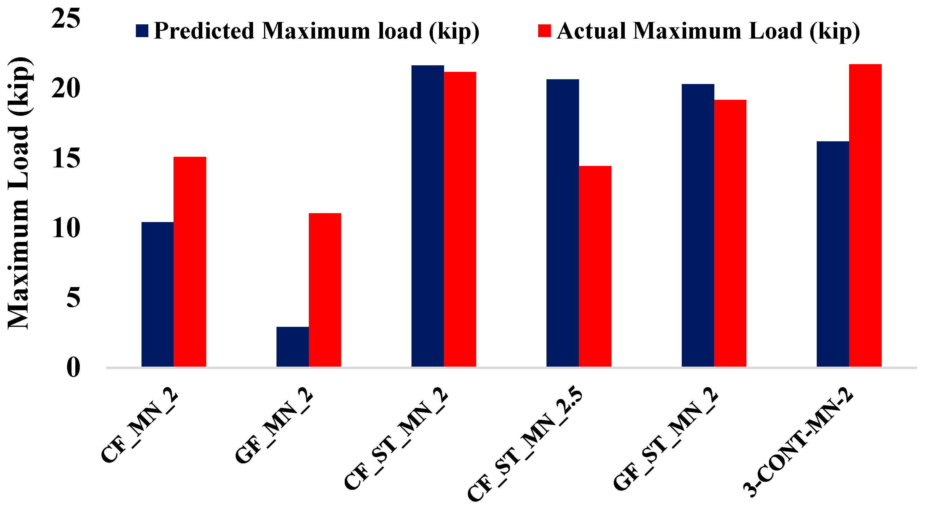 Figure 8 compares the experimental and predicted maximum load capacities of the tested beam specimens, with theoretical values computed using Equation (13). The hybrid specimens exhibited strong alignment with analytical predictions. The CF_ST_MN_2 specimen reached an experimental peak load of 21.15 kips, which is within 2.2% of its predicted value of 21.63 kips. Similarly, the GF_ST_MN_2 specimen demonstrated close agreement, with an experimental load of 19.15 kips compared to a predicted value of 20.30 kips, reflecting a deviation of approximately 6%. In contrast, the CF_ST_MN_2.5 specimen showed a greater deviation, achieving a peak load of 14.43 kips against a predicted value of 20.62 kips, indicating a reduction of around 30%. These results confirm the reliability of current design expressions for hybrid reinforcement systems, where the combined contribution of steel and FRP enhances ductility and enables consistent stress redistribution, consistent with traditional design assumptions. However, at higher shear span-to-depth ratios, the effectiveness of hybrid reinforcement in fully mobilizing flexural capacity may diminish due to the development of wider shear cracks and altered stress redistribution patterns not fully captured by standard flexural models.