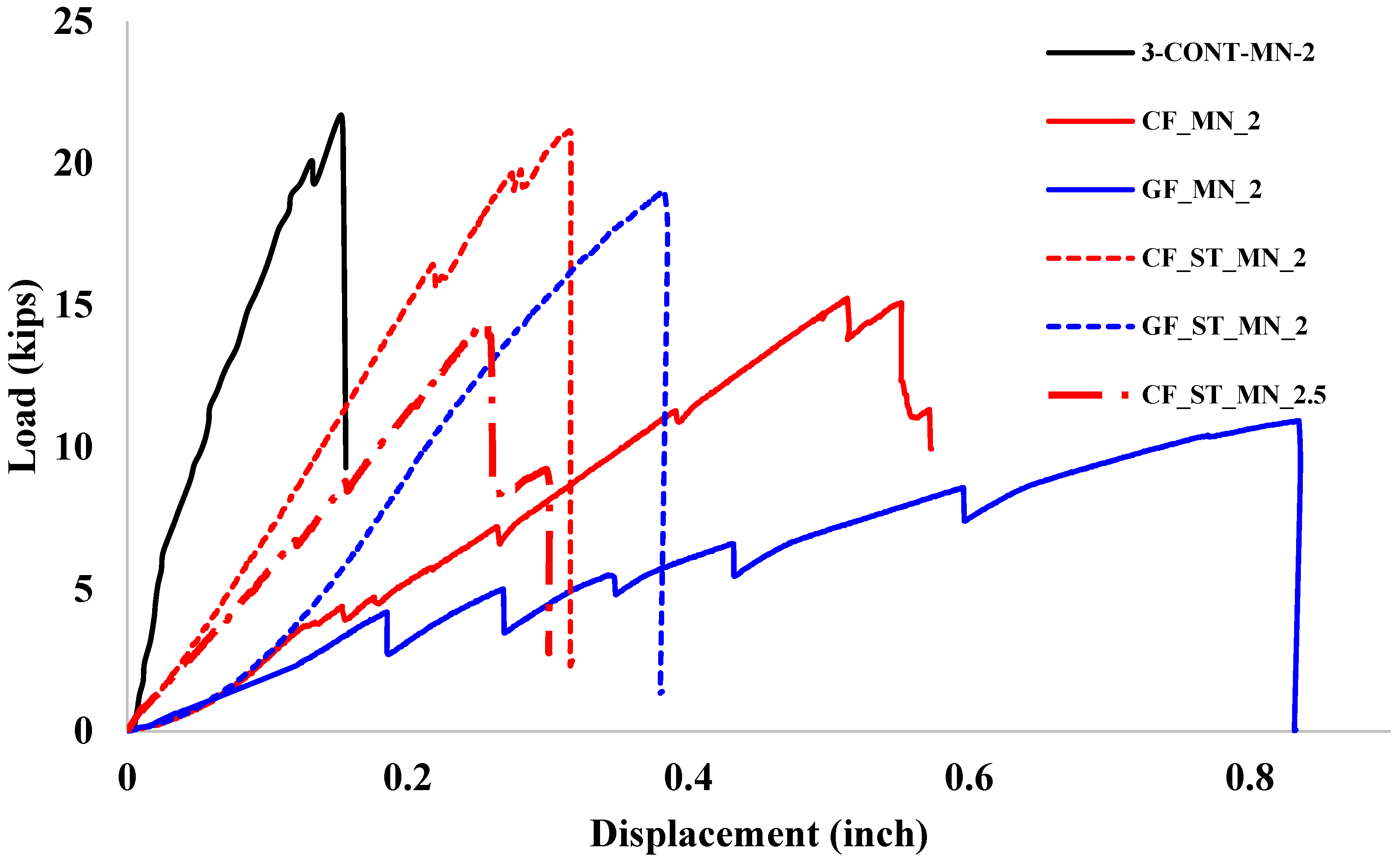 Beams reinforced exclusively with fiber grids exhibited a noticeable reduction in load-carrying capacity. The CFRP-reinforced specimen (CF_MN_2) reached a peak load of 15.25 kips, representing a 29.7% reduction relative to the control beam. The GFRP-reinforced specimen (GF_MN_2) demonstrated an even greater reduction, failing at 10.93 kips, which is 49.7% lower than the control. These findings highlight the inherent brittleness and lower tensile stiffness of fiber-reinforced systems in the absence of steel reinforcement, emphasizing the critical limitations in bond performance under shear-dominant conditions.