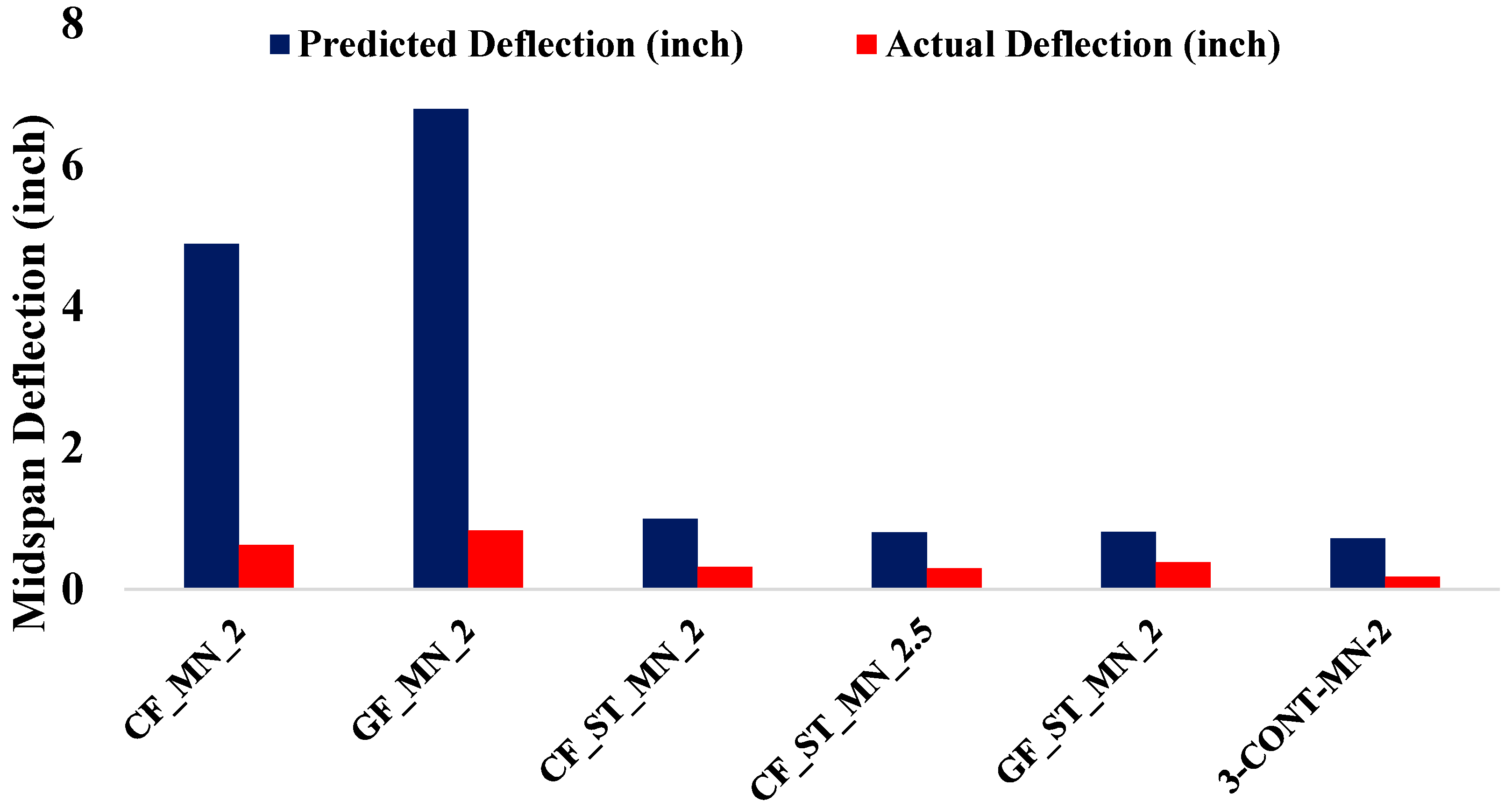 Figure 10 presents the computed and measured midspan deflections of the tested beam specimens, with theoretical values determined using Equation (14). Substantial overpredictions were observed across all specimens, particularly for the FRP-only reinforced beams. For instance, the CF_MN_2 specimen was predicted to exhibit a deflection of 4.89 inches, whereas the measured deflection was only 0.63 inches. Similarly, the GF_MN_2 specimen showed a predicted deflection of 6.79 inches compared to a measured value of 0.84 inches. These overpredictions, by factors ranging from 7 to 8, indicate that the analytical models neglect critical mechanisms such as tension stiffening of the cracked concrete, bond–slip behavior at the reinforcement-concrete interface, and aggregate interlock, all of which contribute to limiting deflections even after cracking.