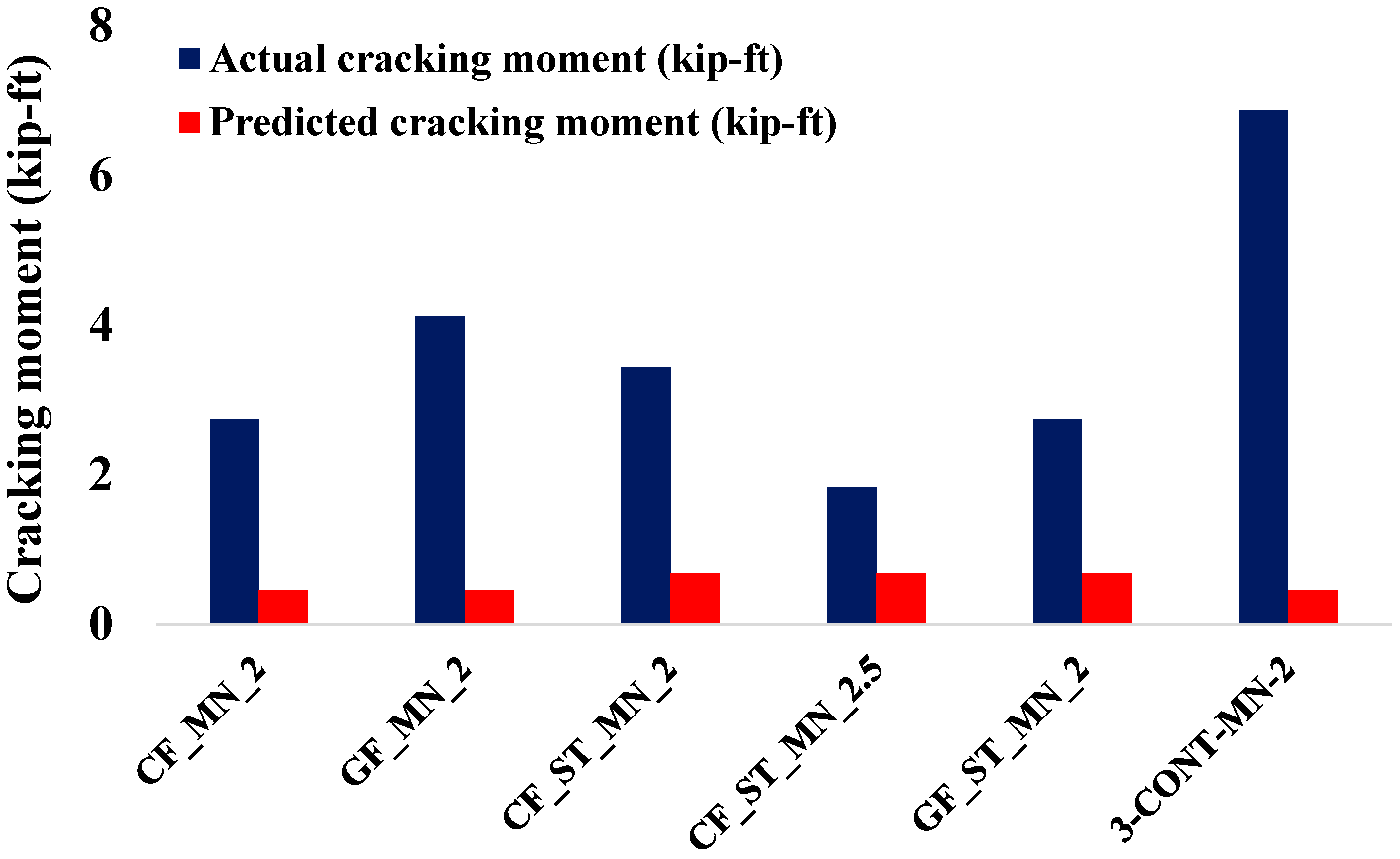 The hybrid specimens demonstrated improved performance, yet the predictive models remained conservative. The CF_ST_MN_2 specimen achieved a measured cracking moment of 3.44 kip-ft, while the CF_ST_MN_2.5 specimen recorded 1.83 kip-ft, and the GF_ST_MN_2 specimen reached 2.75 kip-ft, all compared against the same predicted value of 0.69 kip-ft. These results indicate that the presence of steel within hybrid reinforcement systems enhances crack resistance by providing tension stiffening and effective stress redistribution, leading to higher cracking moments. However, current design codes still fail to fully capture these mechanisms within hybrid systems, resulting in conservative estimates. The steel-reinforced control specimen (3-CONT-MN-2) demonstrated a measured cracking moment of 6.88 kip-ft, considerably higher than the predicted value of 0.46 kip-ft. This further indicates that current predictive formulations may inadequately represent the higher tensile performance of high-strength concrete and the beneficial interaction between steel reinforcement and concrete during crack formation.