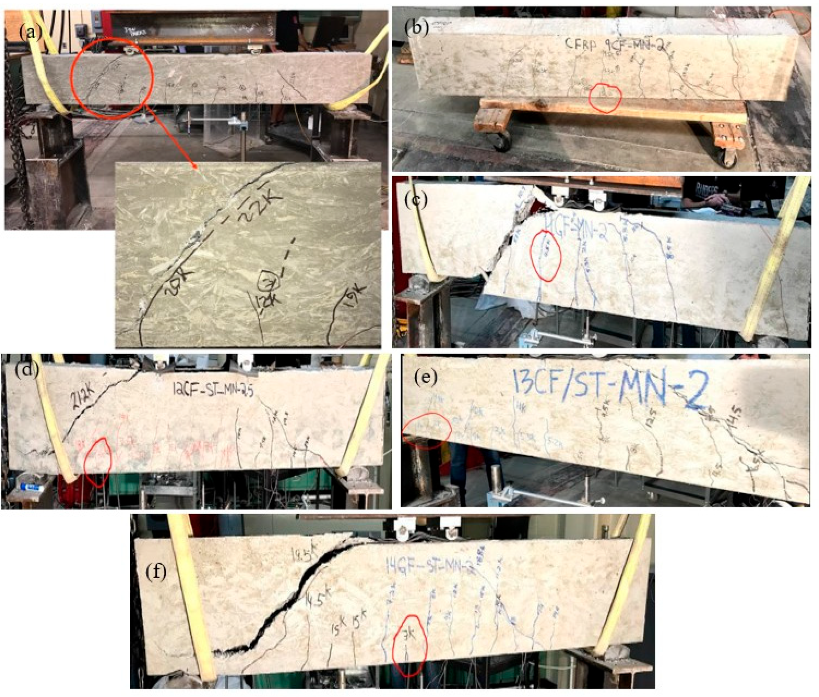 Figure 13d–f, exhibited similar diagonal cracking patterns but with narrower crack widths due to the bridging and dowel effects provided by steel reinforcement, thereby demonstrating improved post-cracking integrity. Across all specimens, the observed failure cracks were inclined at approximately 45–55° relative to the horizontal, consistent with classical shear failure mechanisms in reinforced concrete beams. No significant horizontal splitting cracks were noted at the reinforcement level, indicating that aggregate interlock and dowel action remained active until failure. The incorporation of FRP grids, even within hybrid reinforcement systems, did not alter the fundamental diagonal tension failure mode in the absence of shear reinforcement.