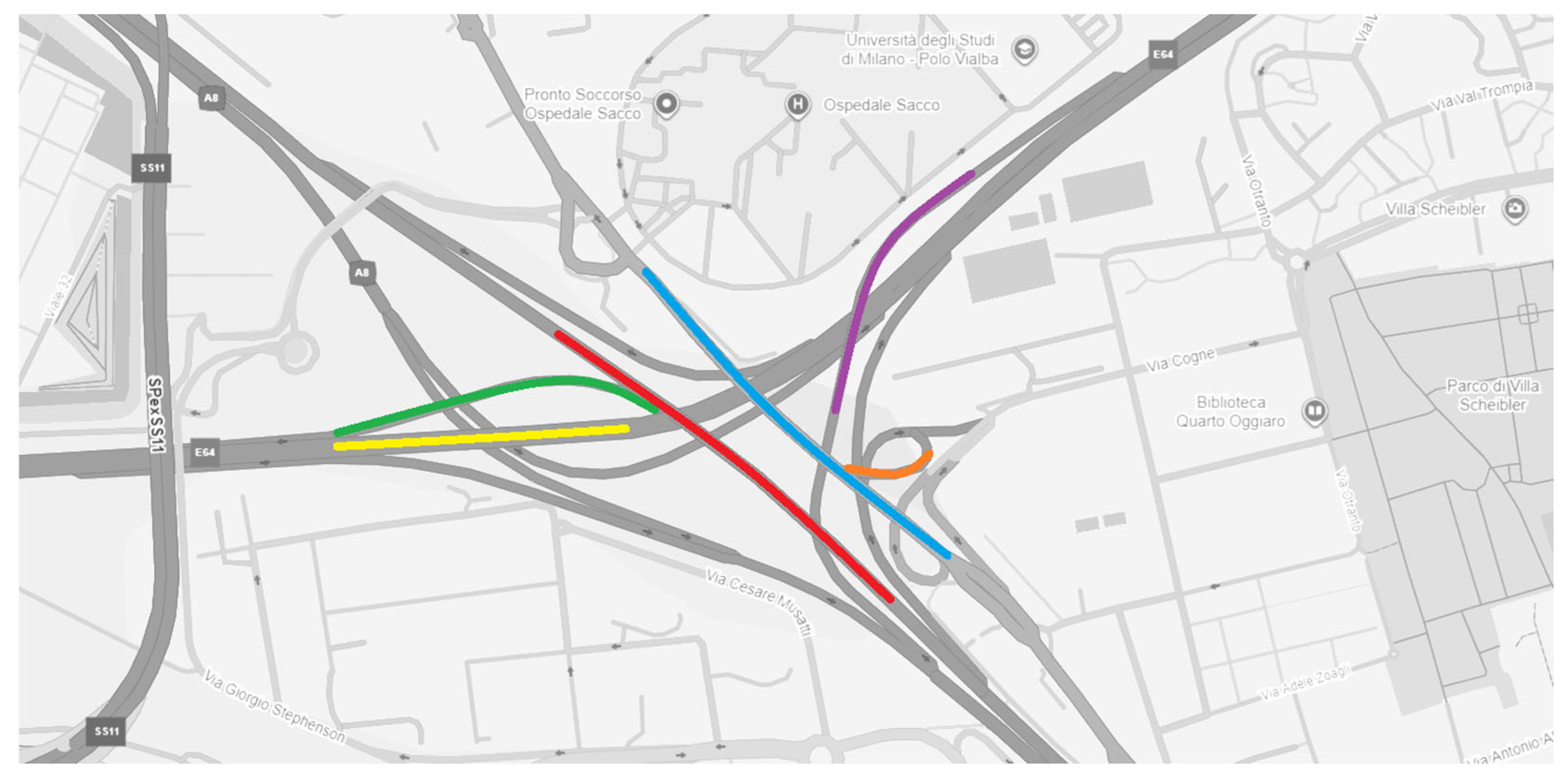 The interchange is composed of six viaducts, identified by specific numerical codes and corresponding color labels shown in