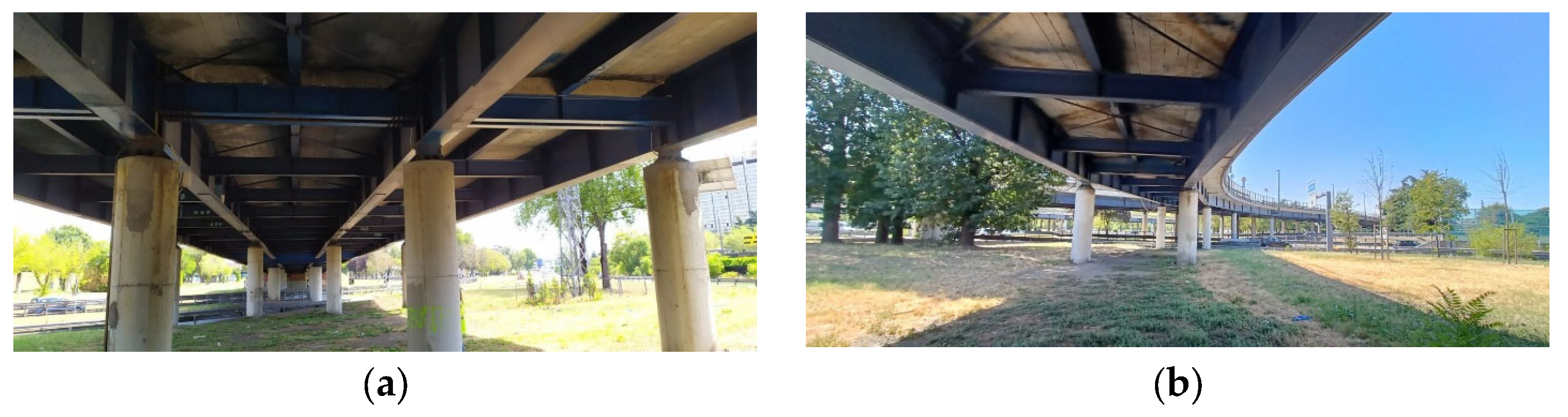 The proposed signal-based identification framework was implemented and tested on an existing composite steel–concrete bridge system forming part of a major highway interchange in Northern Italy. The structure represents a typical example of medium-span composite viaducts, characterized by repetitive span configurations and subjected to high levels of traffic-induced vibration.