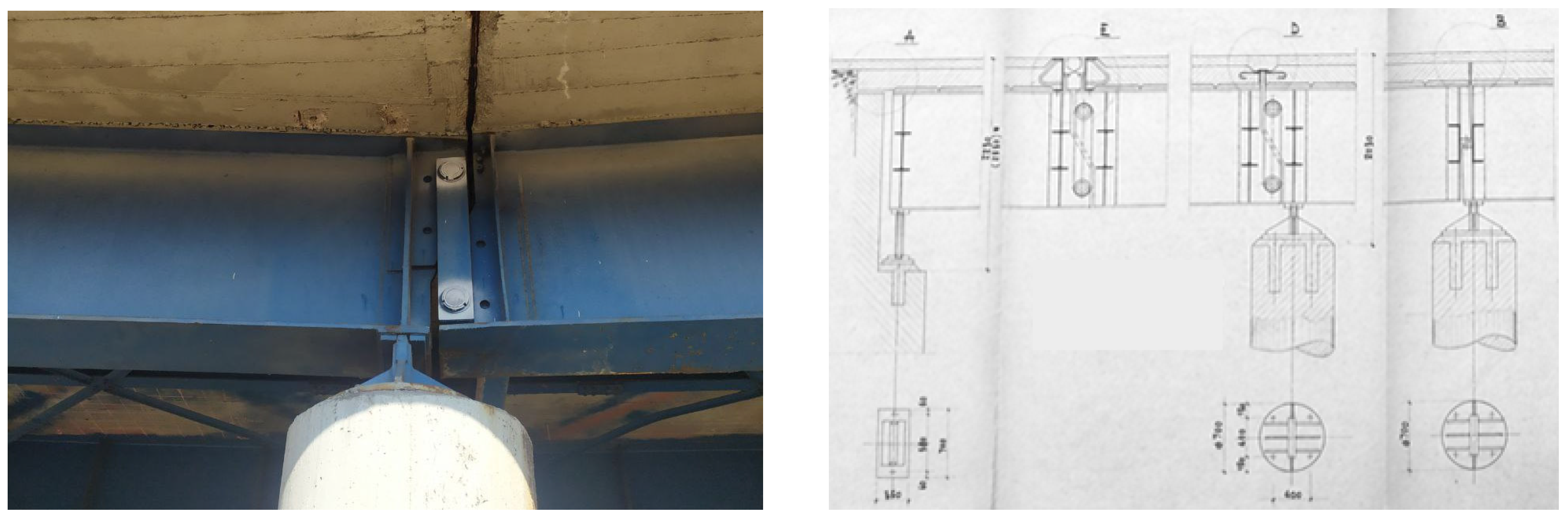 Figure 3, represents one of the most distinctive features of this bridge type. In each pier region, one span rests directly on the columns, transferring loads through conventional steel bearings, while the adjacent span is suspended from the first one through a hanging-link system. As a result, each deck is alternately supported and suspended: at one end it sits directly on the pier, whereas at the opposite end it is hung from the neighboring span. This configuration produces a coupled dynamic interaction between consecutive spans, modifying both the effective boundary conditions and the modal characteristics of the decks. Although this arrangement efficiently accommodates longitudinal displacements, it also introduces additional complexity in interpreting the measured dynamic response as the stiffness of the hanger in the horizontal transverse direction is quite uncertain.