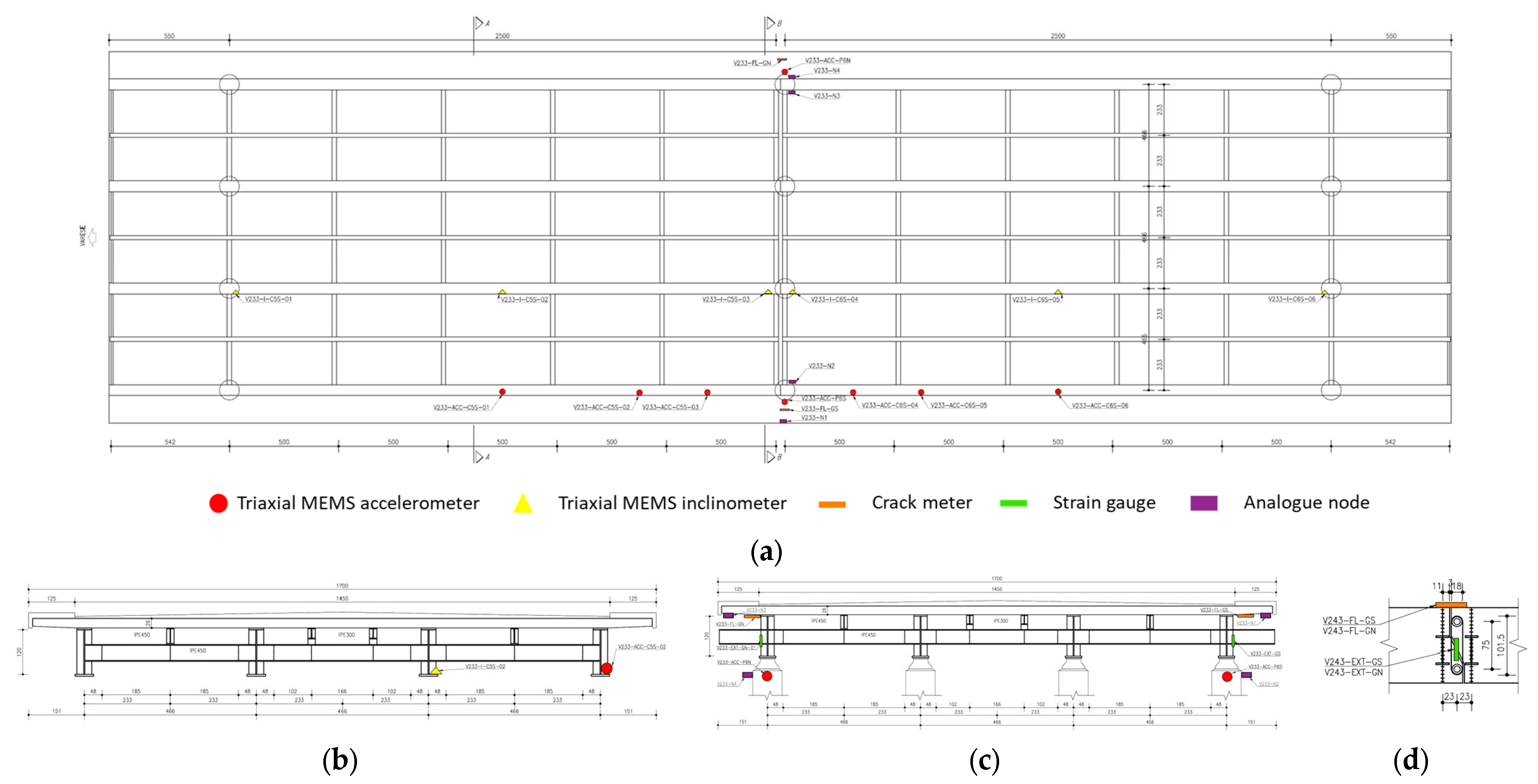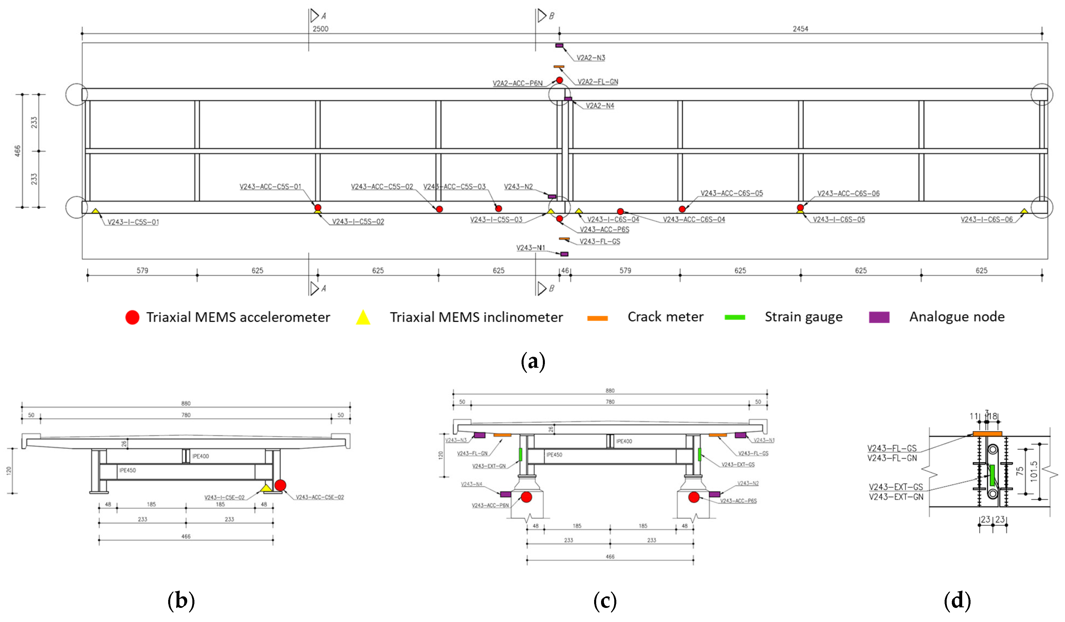 The monitoring system installed on the bridge includes both dynamic and static sensors, designed to capture complementary aspects of structural behavior. Static instrumentation comprises inclinometers and strain gauges, which are used to monitor slow-varying phenomena such as deflection trends, long-term deformations, and stress variations in critical sections.