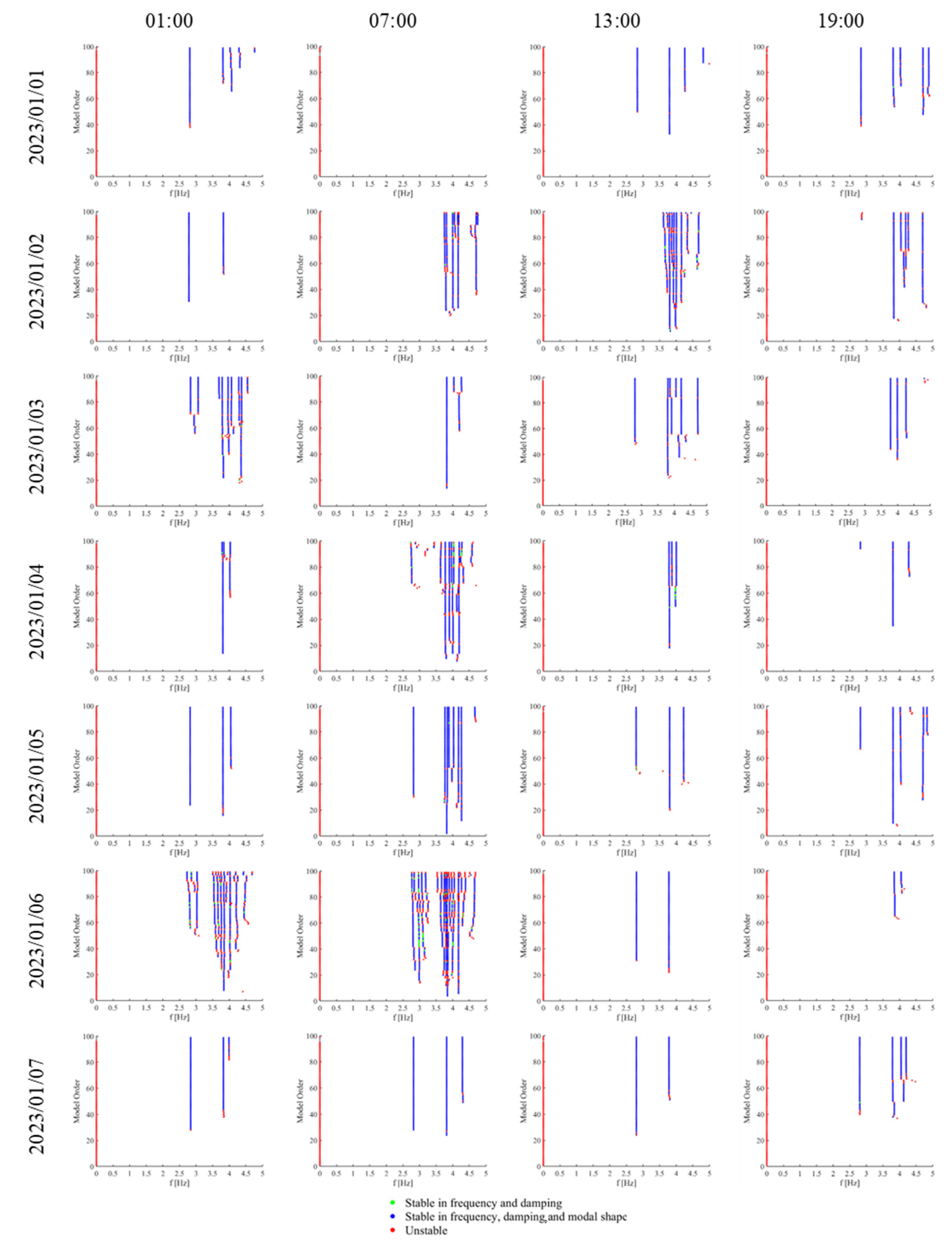 Figure 6 shows a collection of stabilization diagrams obtained over seven consecutive days of monitoring (i.e., from Sunday 1 January 2023 to Saturday 7 January 2023). Each row corresponds to one calendar day, while each column represents one of the four scheduled acquisitions: at 01:00, 07:00, 13:00, and 19:00 h. The frequency range investigated is 0–5 Hz.
