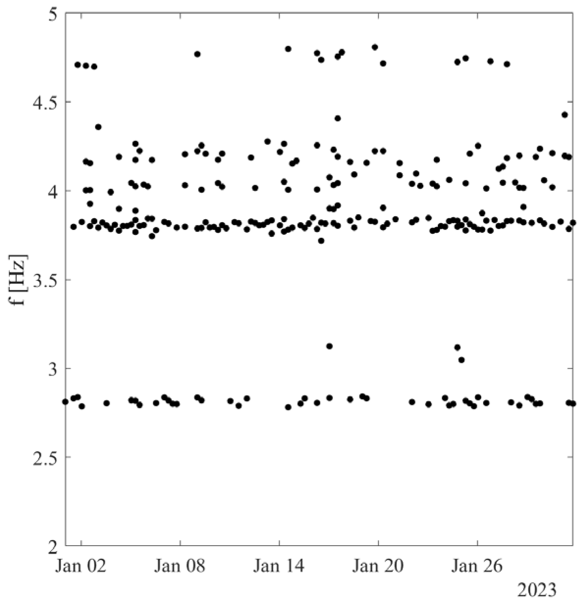 Figure 7, which reports the identification results for all scheduled recordings during January for viaduct 2A2. The frequencies obtained with both procedures are approximately 3.75 Hz, 3.95 Hz, and 4.20 Hz, matching the dominant clusters observed in the full-month analysis (shown in