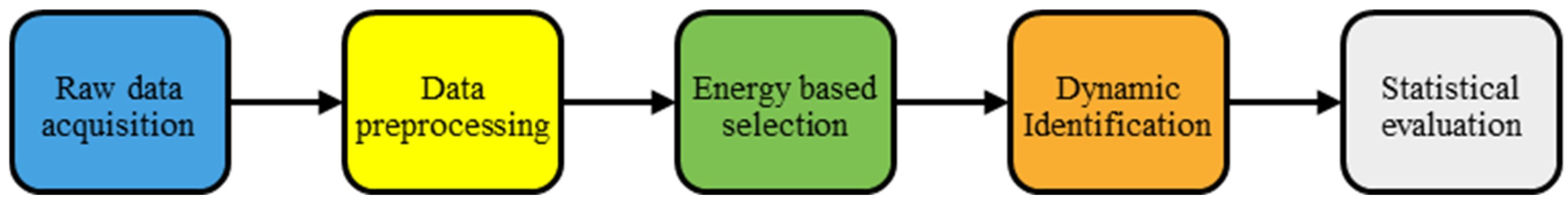 The methodological framework adopted in this study aims to extract reliable dynamic characteristics (i.e., frequencies and modal shapes) of composite bridge decks from short-duration acceleration records (102.4 s), while minimizing manual intervention in data processing. The complete workflow consists of four main stages: