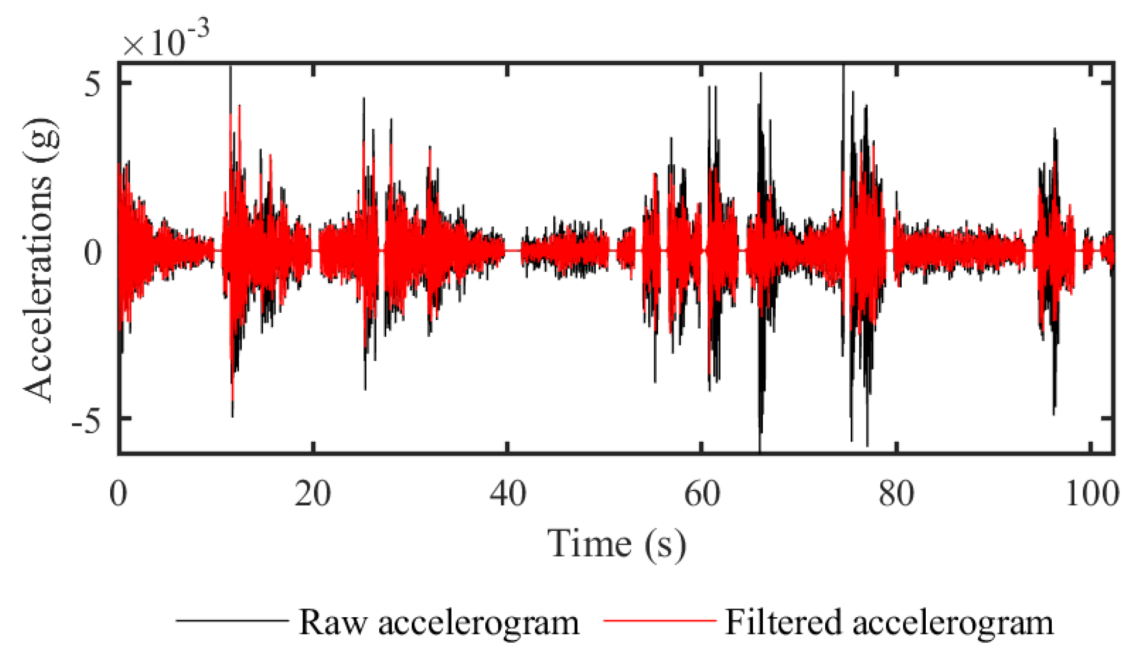 24], to ensure consistency and comparability. Each raw signal is filtered using a band-pass filter tailored to the expected frequency range of the bridge (0–20 Hz) [