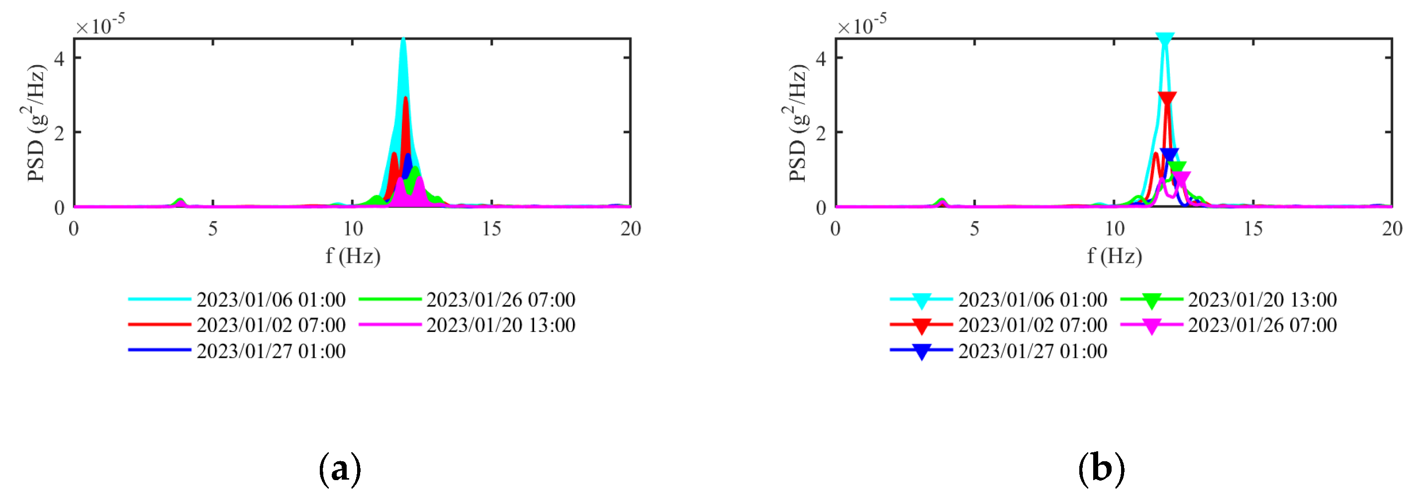 40]. No progressive drift or sudden changes in acceleration amplitude are observed, suggesting the absence of any significant stiffness loss or structural degradation during the observation period.