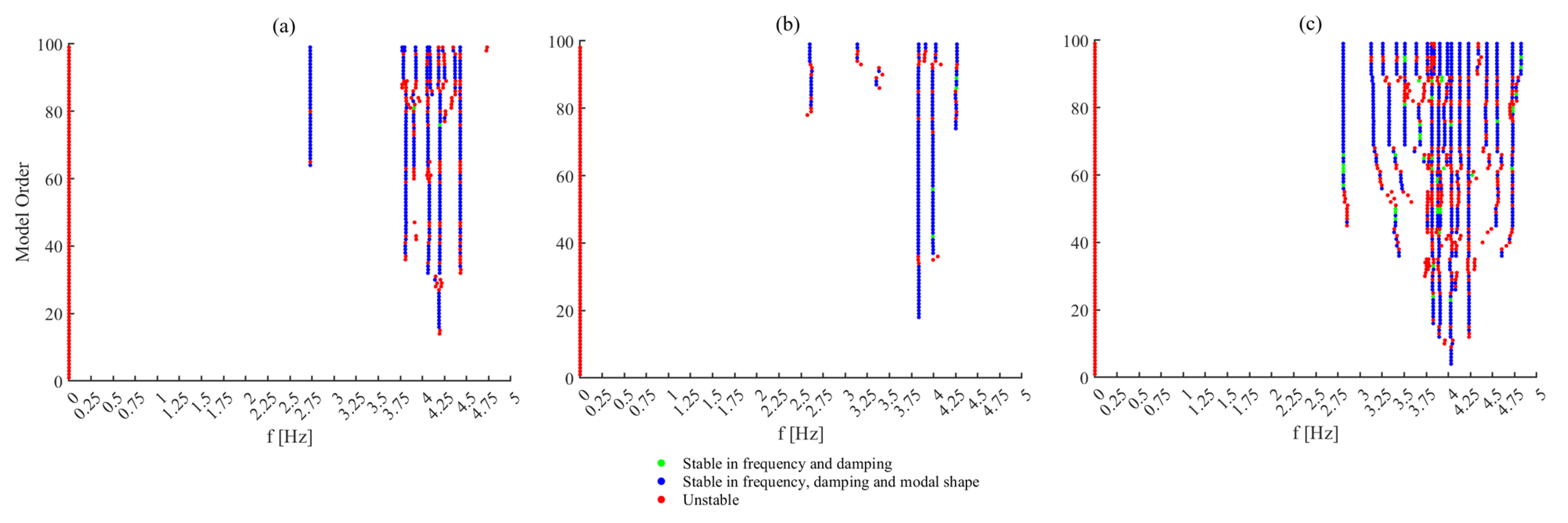 Across the three datasets, a consistent pattern of stable poles is observed, confirming the repeatability of the identified dynamic characteristics. The most pronounced vertical alignments of blue markers, corresponding to stable poles in all parameters, occur in the frequency range between 3 Hz and 5 Hz, which represents the dominant vibration region of the structure. Compared to