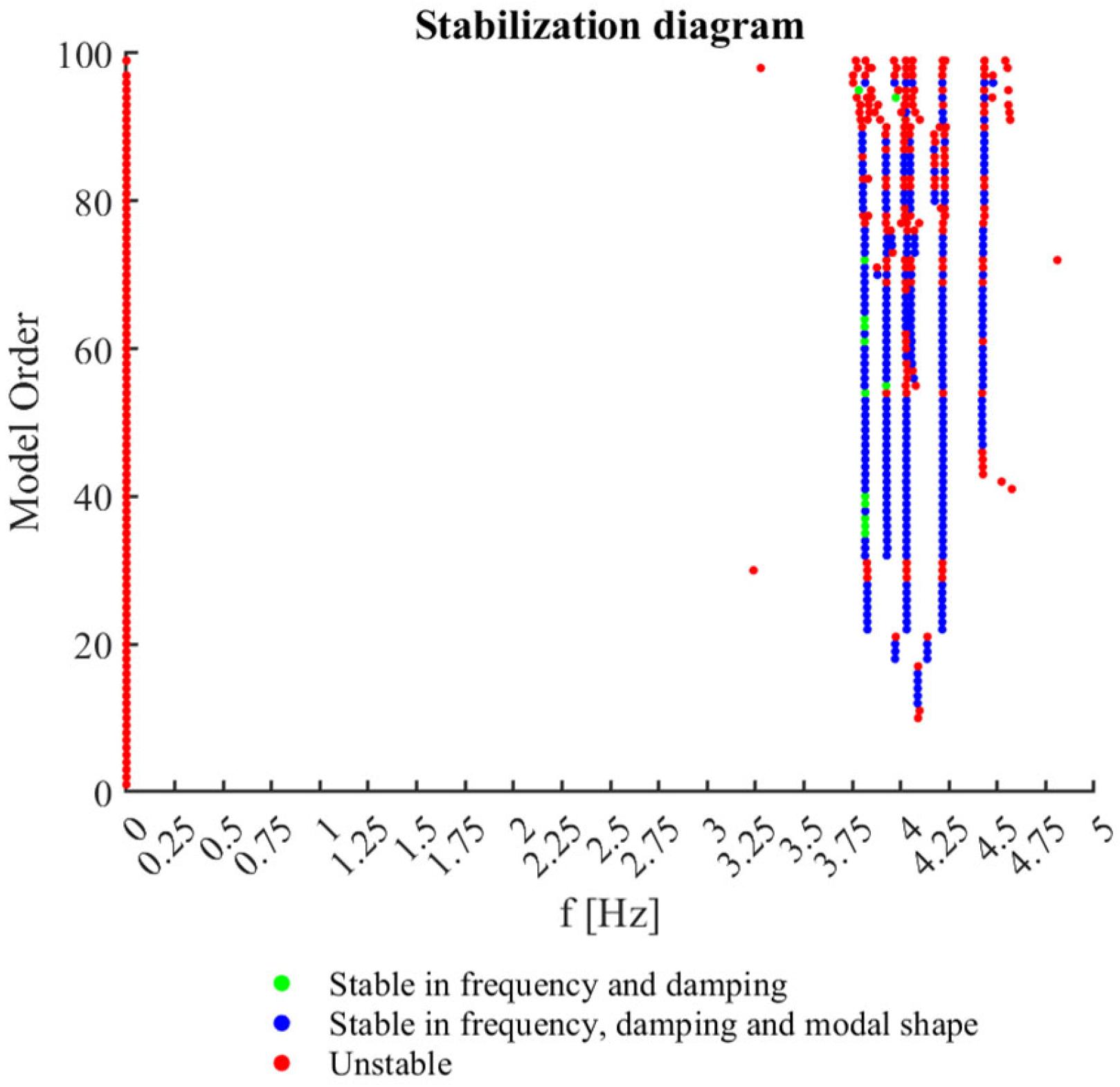 33] to automate the detection of consistent poles. Clusters of stable poles represent the identified natural modes of the structure. In this study, the clustering parameters were defined to ensure both statistical robustness and selectivity: the minimum number of poles required to form a valid cluster was set equal to 50% of the maximum model order, while the maximum Euclidean distance between each pole and the cluster centroid was limited to 0.01; this value was determined through a sensitivity-based tuning process, seeking an optimal balance between cluster compactness and robustness of the modal identification results. These thresholds were chosen to guarantee the physical consistency of the identified modes and to filter out spurious poles associated with noise or weak stabilization.