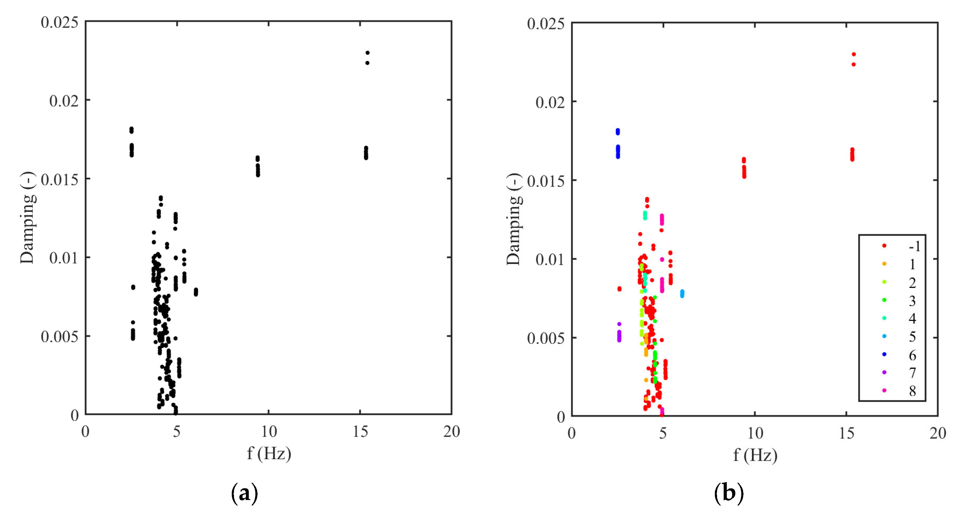 Figure 13a shows the distribution of all stable poles in the frequency–damping space, obtained after the application of the stabilization criteria defined in Equation (1). Each point corresponds to a pole that remained stable across consecutive model orders.