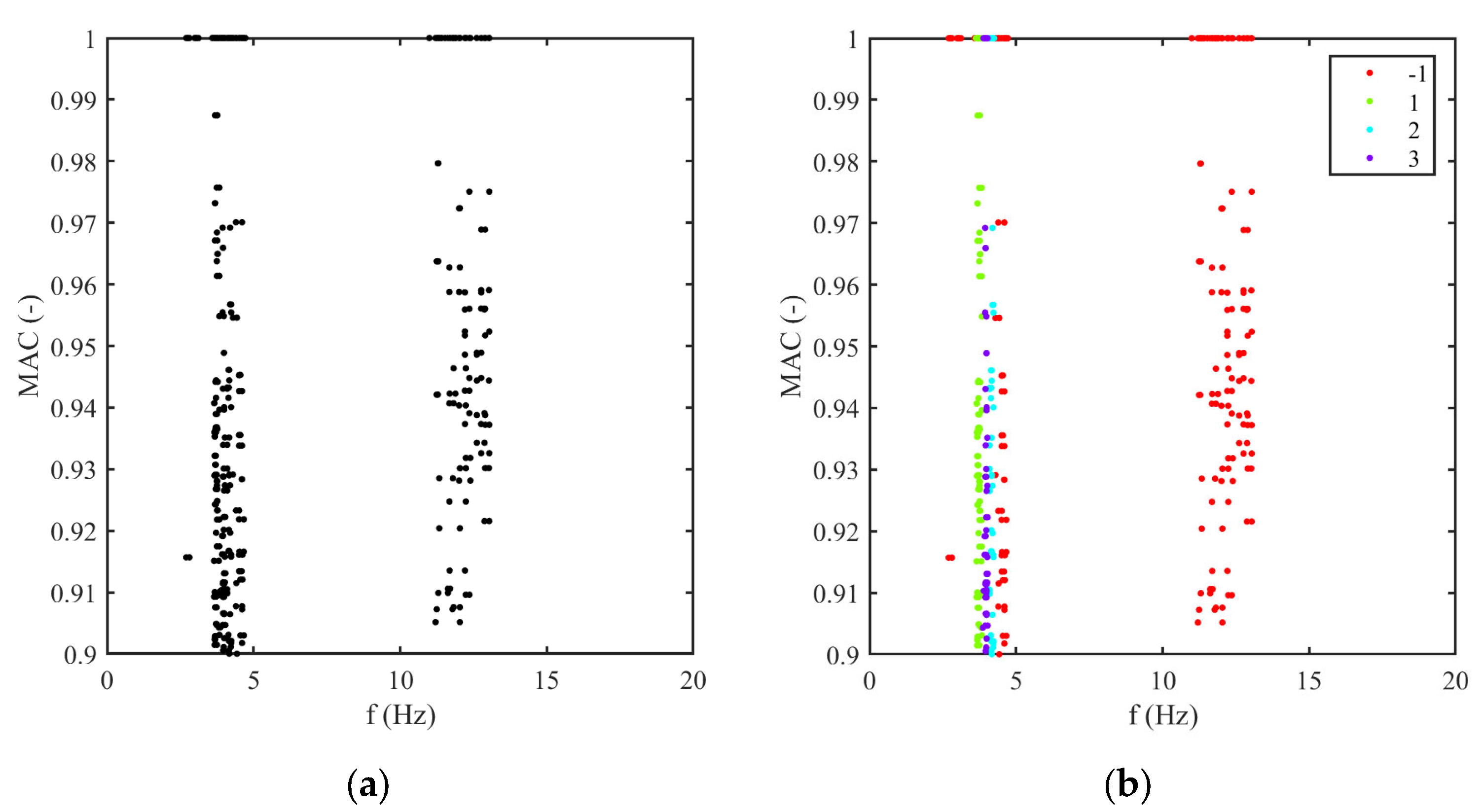 Figure 14b shows the results of the clustering algorithm, where each color represents a distinct cluster corresponding to a recurring mode of the structure. The label—1 identifies isolated points that do not belong to any cluster. In the clustering configuration, the maximum Euclidean distance of each mode from the cluster centroid was set to 0.075, ensuring a compact grouping of modes with similar frequencies and modal shapes. The clustering distance parameter was selected through a sensitivity analysis of the clustering procedure. Due to the presence of closely spaced modes with very similar mode shapes, the chosen value represents a compromise that allows nearby modes to be distinguished without merging them into the same cluster, while avoiding ambiguous or unstable clustering results.