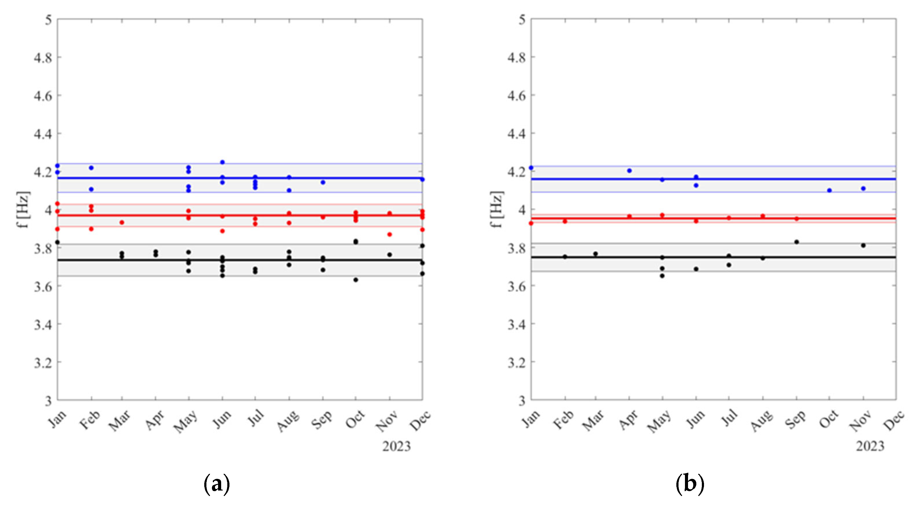 Figure 15b presents the results obtained by merging the three selected 102.4 s recordings for each month into a single dataset prior to modal identification. The results show frequency values and variability trends consistent with those obtained from the independent datasets. The confidence bands remain of similar width, and the number of identified modes is unchanged. In some cases, the artificial concatenation of short records may even introduce small inconsistencies due to non-stationary excitation conditions between different acquisitions.