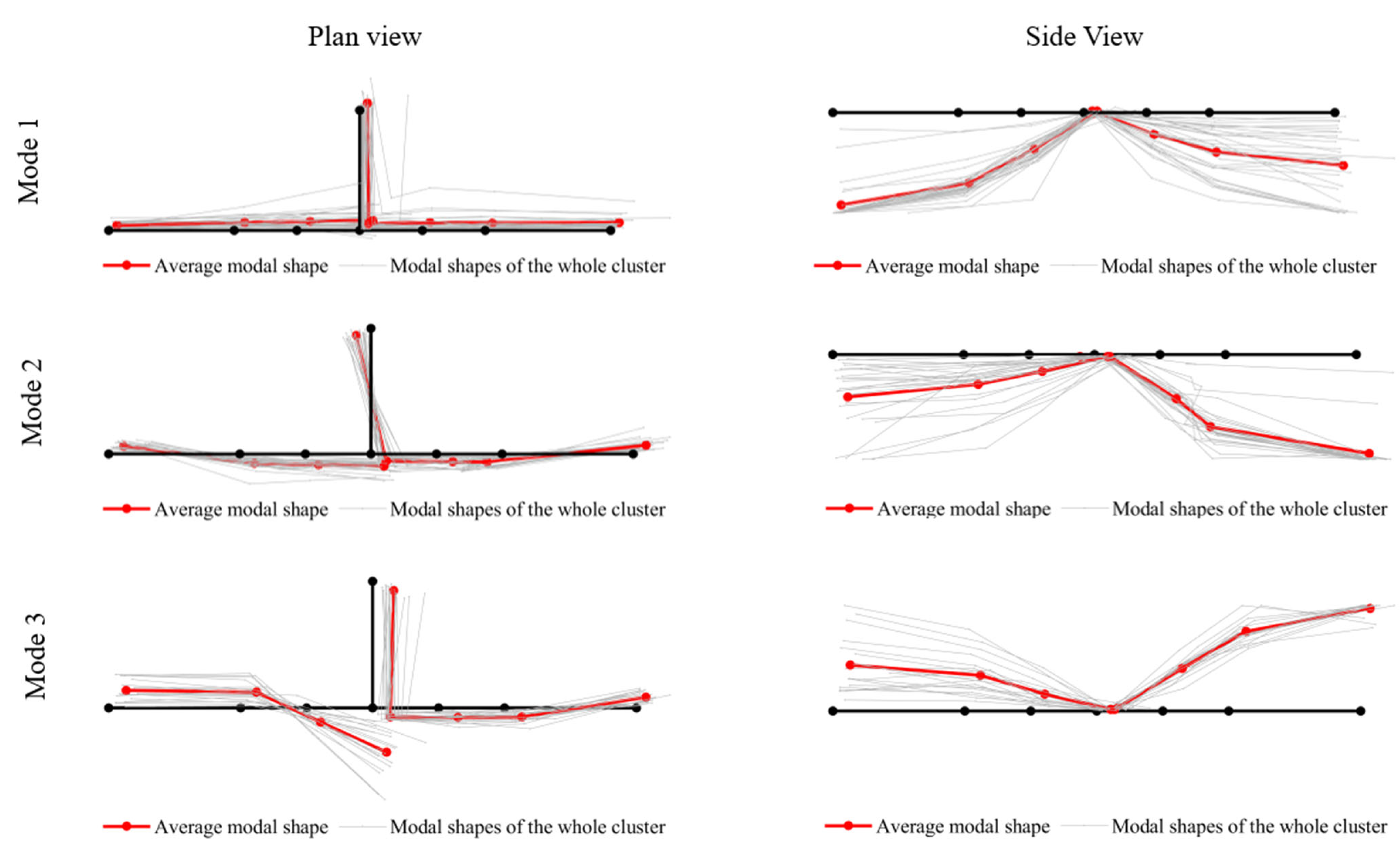 The mode shapes associated with each identified mode were obtained by computing the average of all mode shapes belonging to the same cluster.