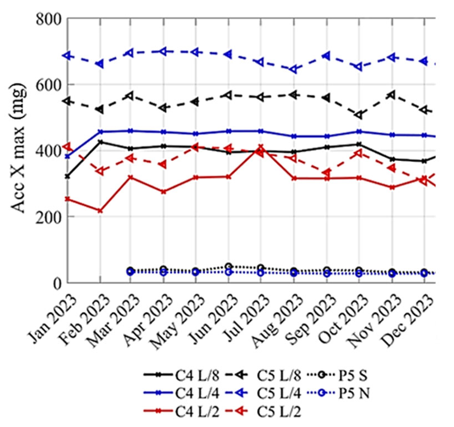 Figure 17 shows the monthly trend of the maximum peak-to-peak accelerations measured in the vertical (gravitational) direction for all accelerometers installed on the composite viaduct 2A2. The sensors are mounted on the edge girder of span 4 (C4) and span 5 (C5) at three longitudinal positions—L/8, L/4, and L/2—while two additional sensors (P5 N and P5 S) are located on the pier between the spans.