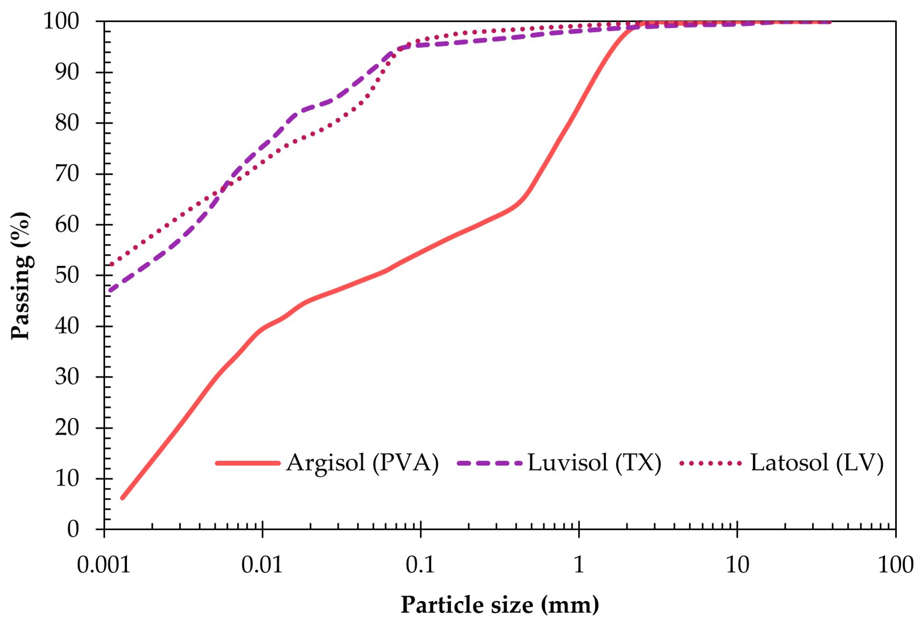 | Property | Argisol (PVA) | Luvisol (TX) | Latosol (LV) | |