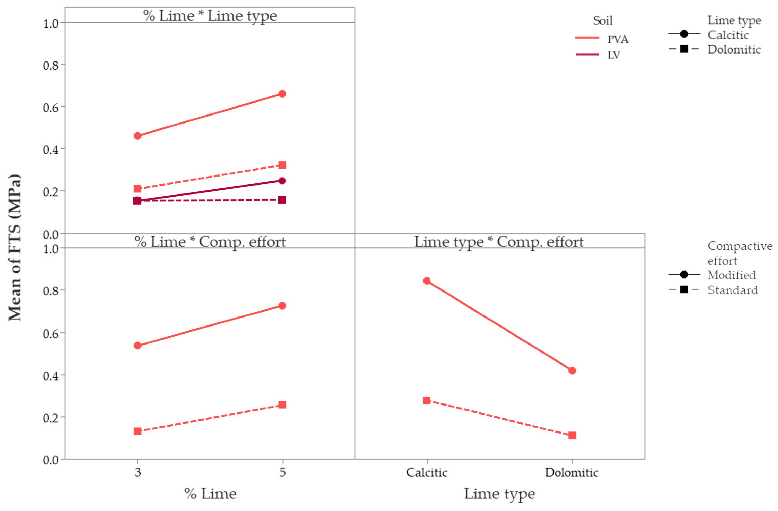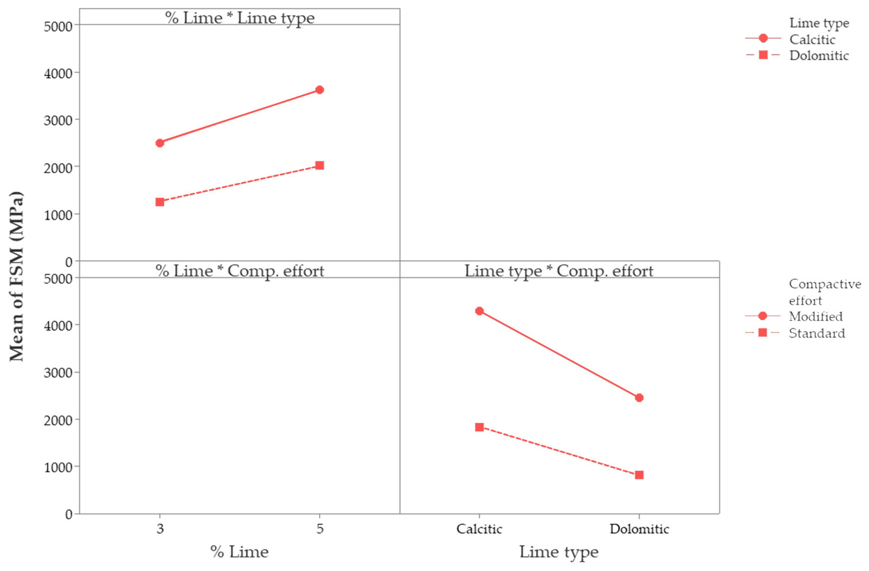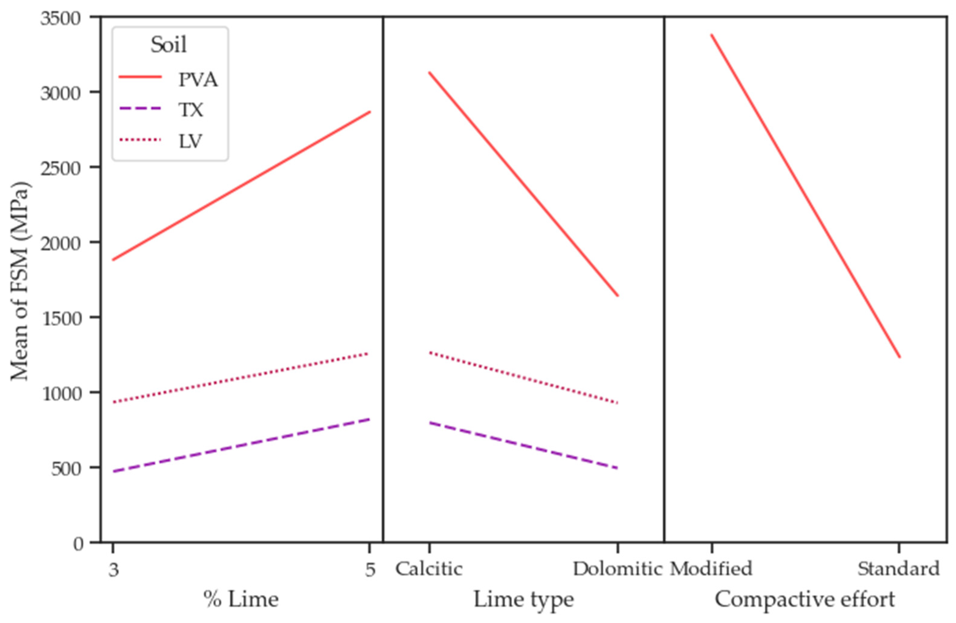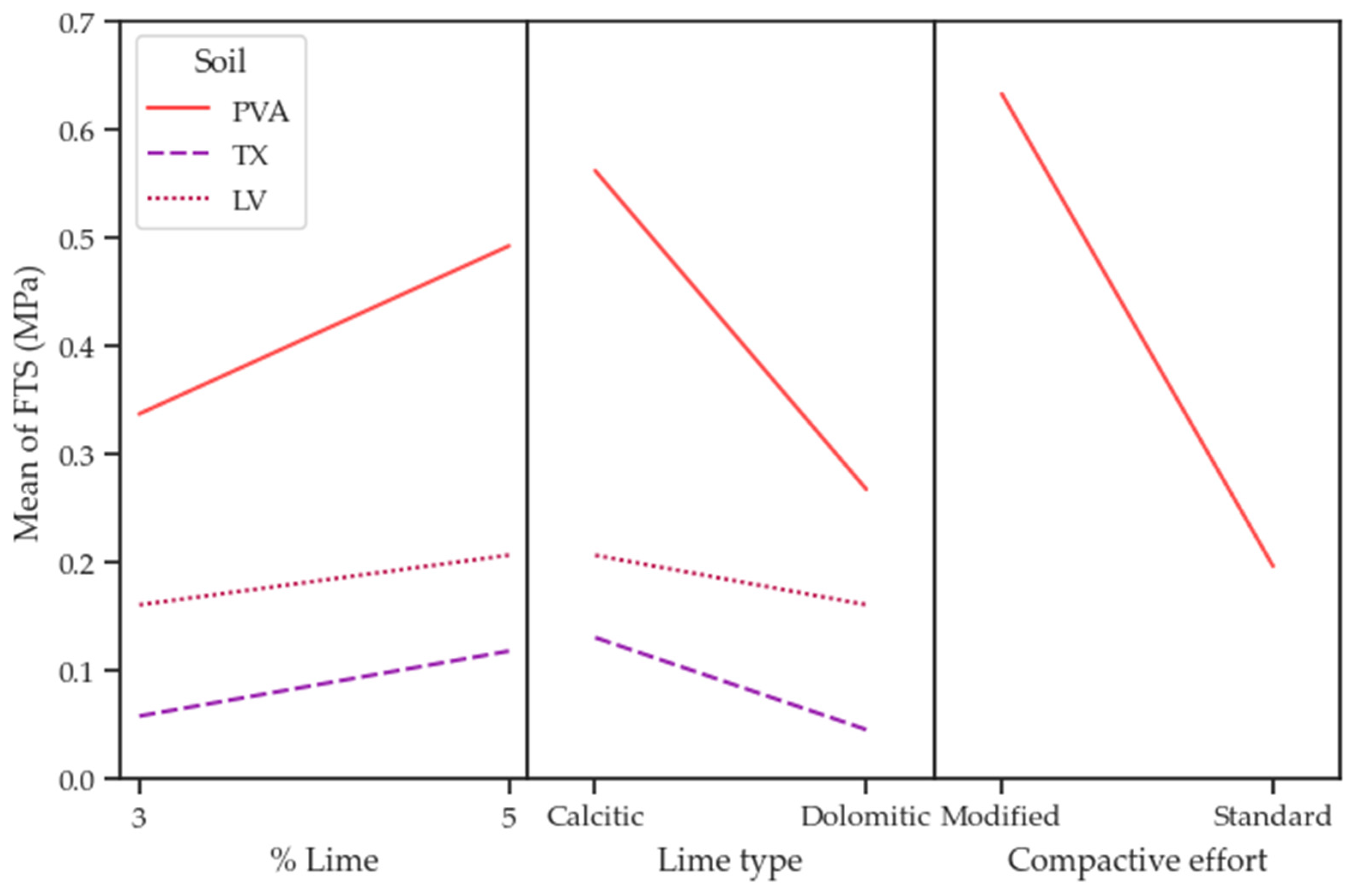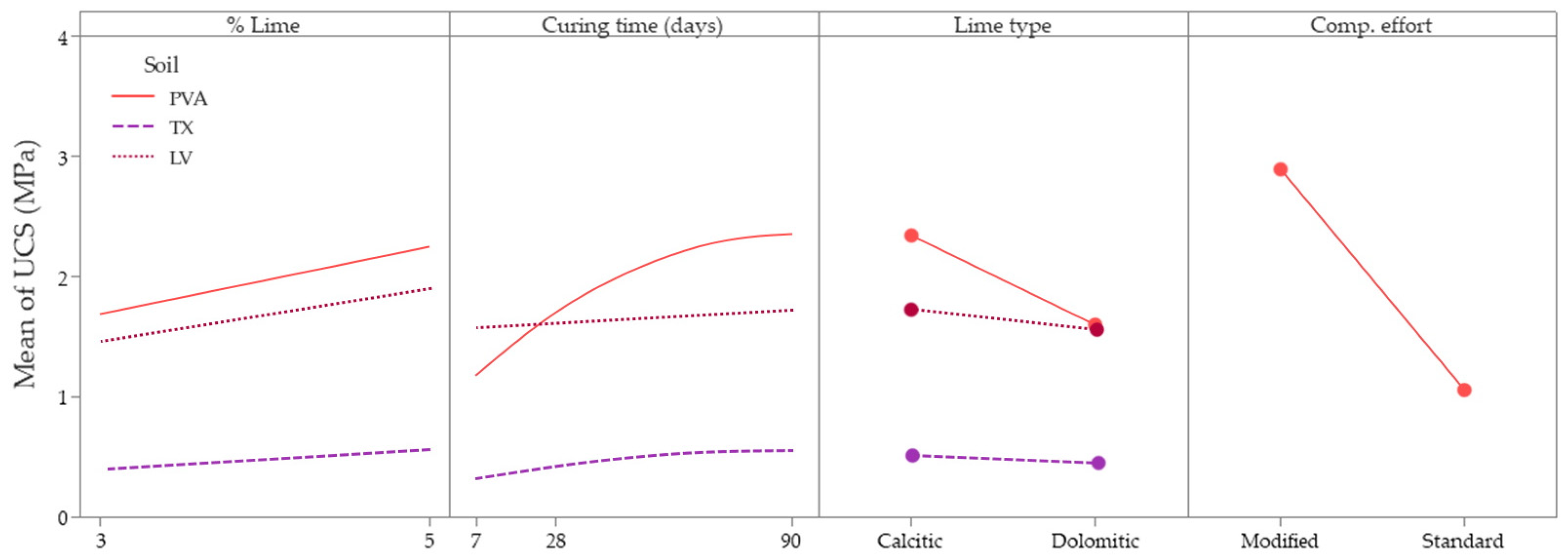 - Mechanical behavior of soil–lime mixtures was influenced by the study’s controllable factors, with compactive effort emerging as the dominant factor within the evaluated experimental framework, followed by lime type and lime content. The use of higher lime content (5%) resulted in increased strength and stiffness, especially in combination with calcitic lime and modified compactive effort. These results have direct implications for field construction: increasing compactive effort, an operationally achievable measure in practice, provides substantial performance gains without requiring excessive lime contents, which may induce shrinkage, thereby promoting both cost-effectiveness and structural reliability.