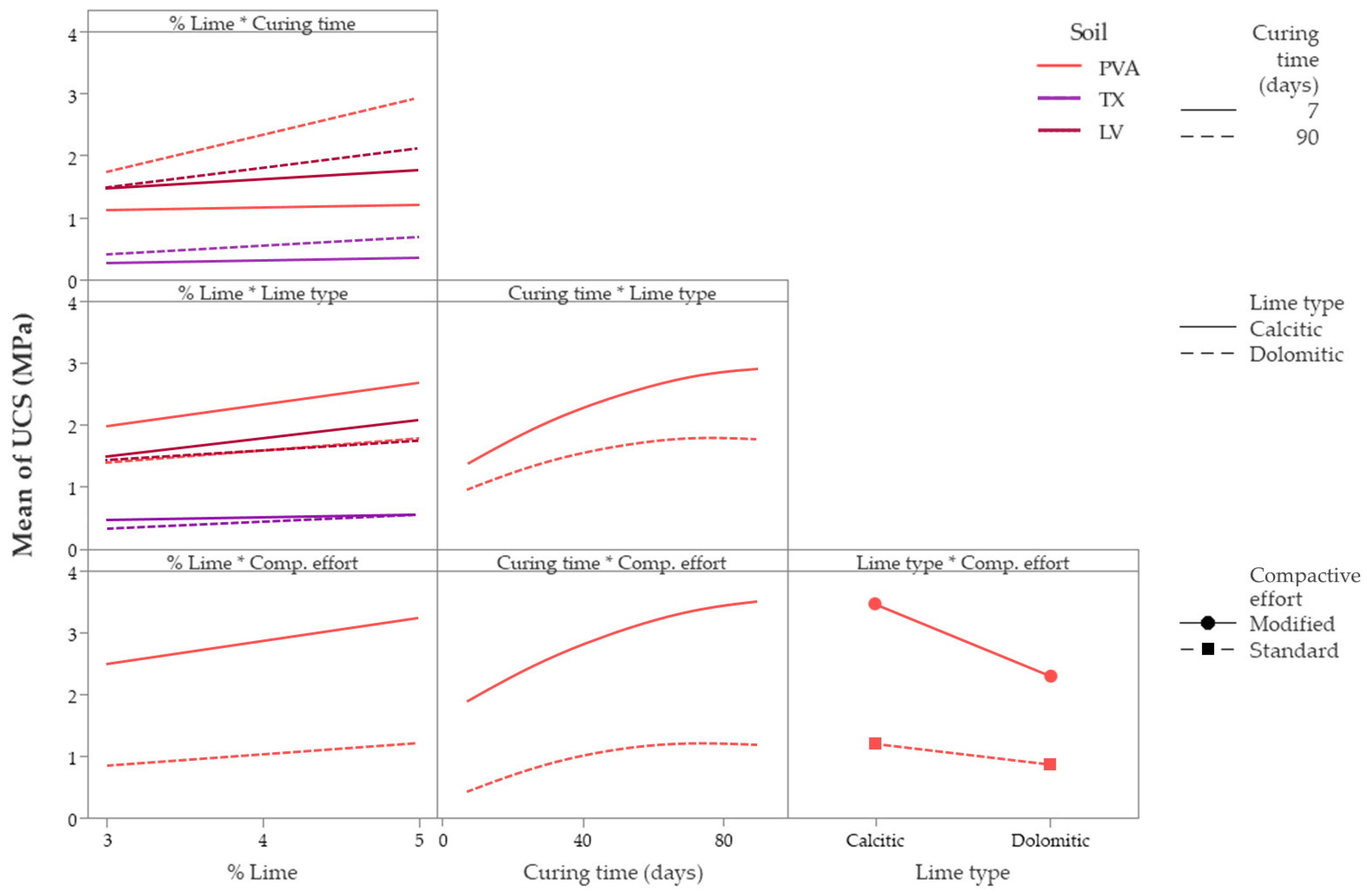 - Curing time significantly influenced unconfined compressive strength, confirming the time-dependent development of pozzolanic reactions. A strong interaction between lime content and curing time was observed: lime content exerted minimal influence at 7 days but became increasingly significant after 28 and 90 days, indicating progressive lime consumption and cementitious development as curing advances. Overall, longer curing time yielded higher UCS values.