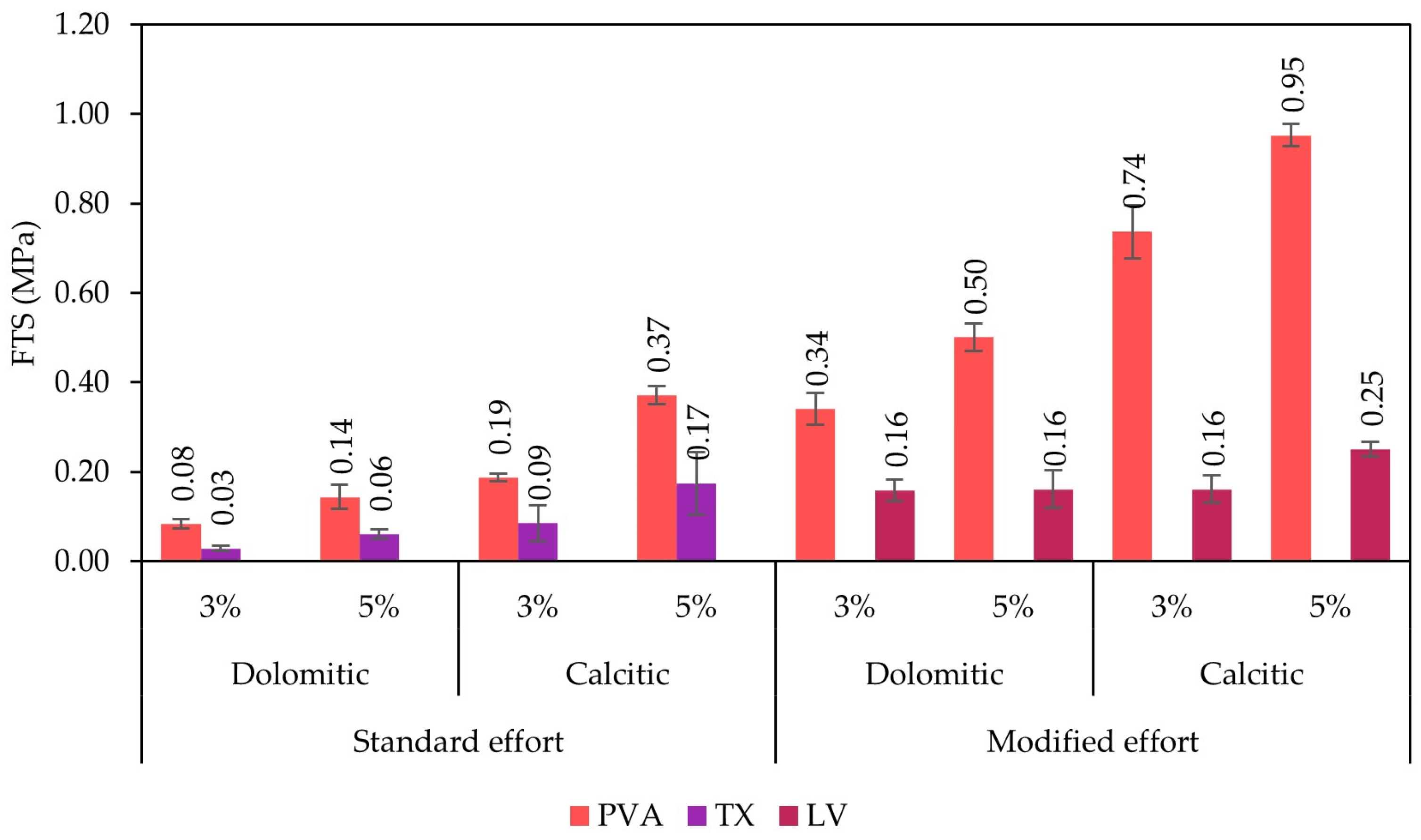 - Calcitic lime produced superior mechanical behavior compared with dolomitic lime. This effect is attributed to higher Ca(OH)2 content (93% vs. 44%), lower retained fraction on the 0.075 mm sieve (0.2% vs. 17.8%), and lower particle density (0.4 vs. 0.6 g/cm3), resulting in greater surface area and higher dissolution rate. These properties contributed to enhanced reactivity and cementation, particularly when combined with higher compactive effort.